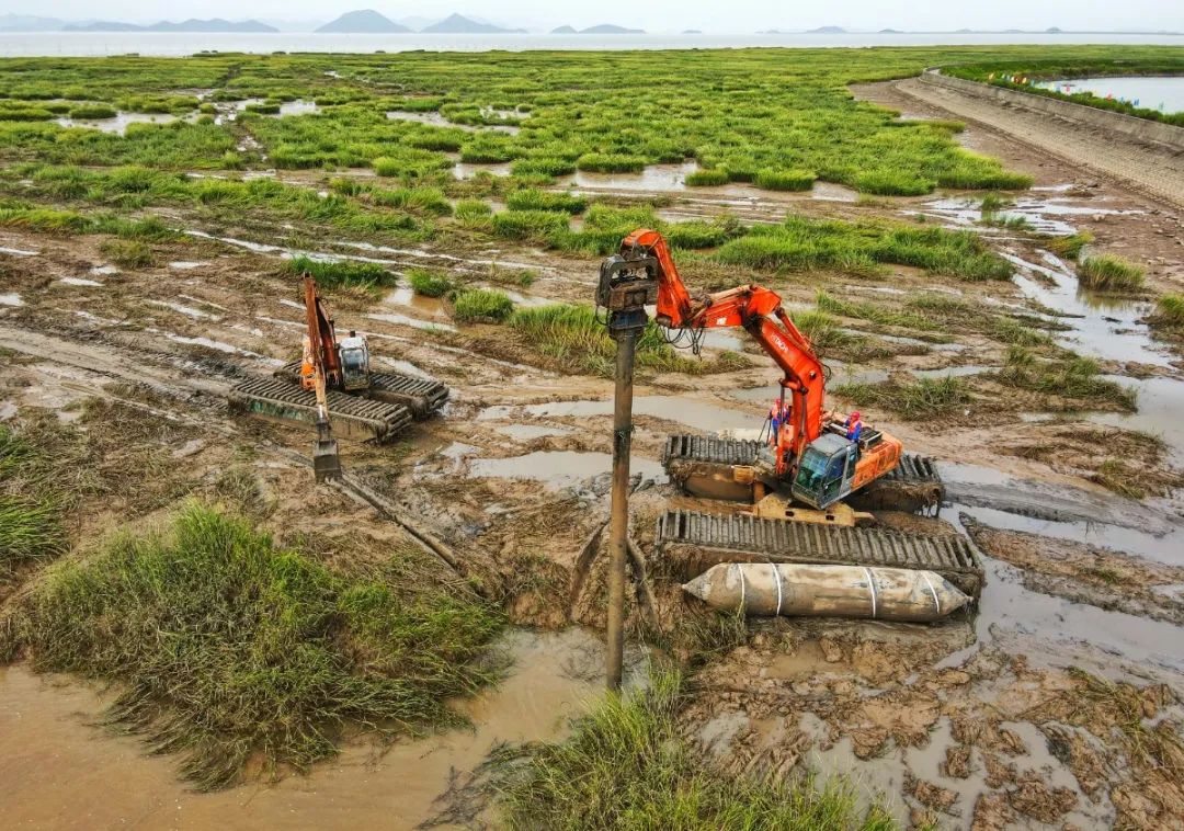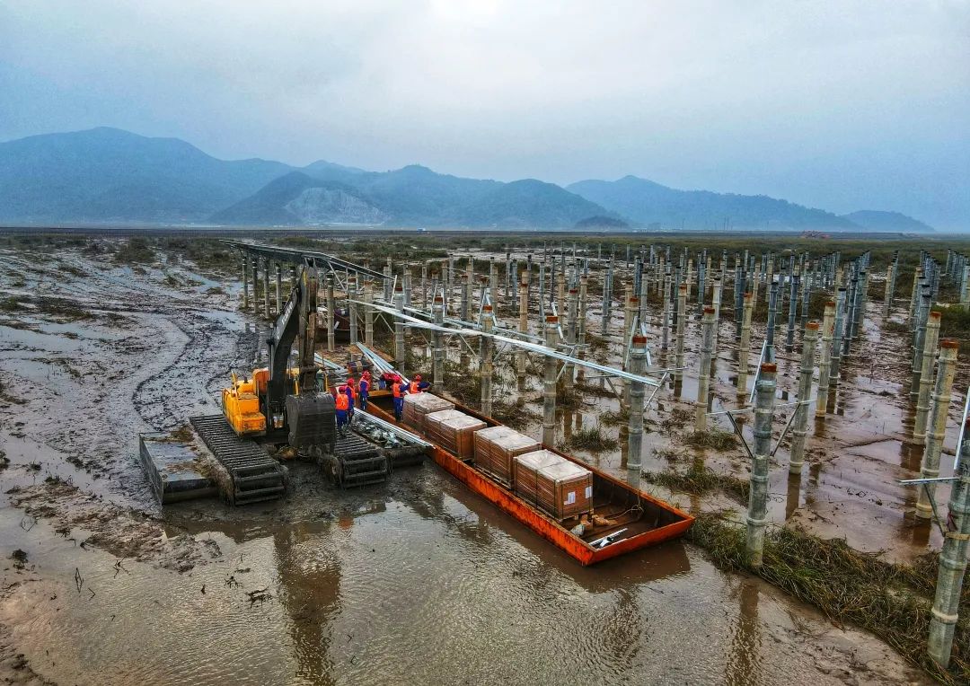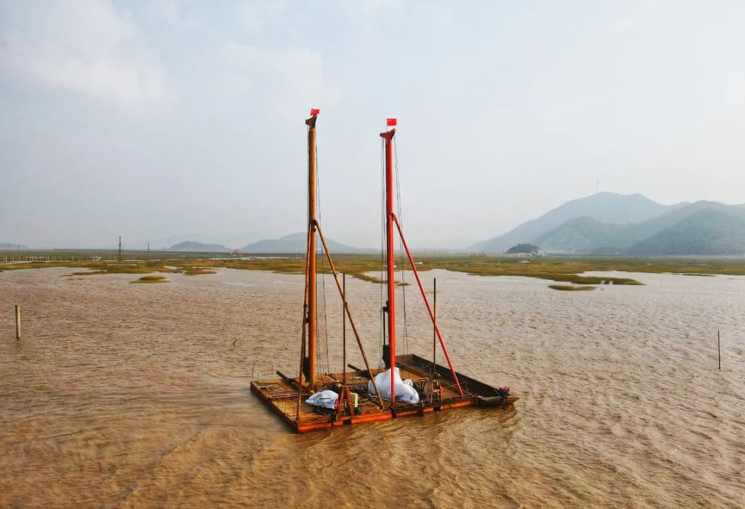因运输物资量大、滩涂行走困难,项目部趁涨潮拖桩,后期建设围堰和临时通道,方便物资运输和施工。