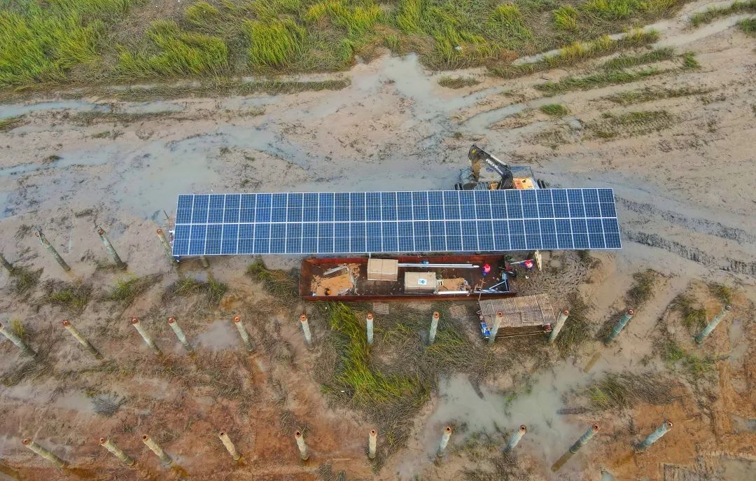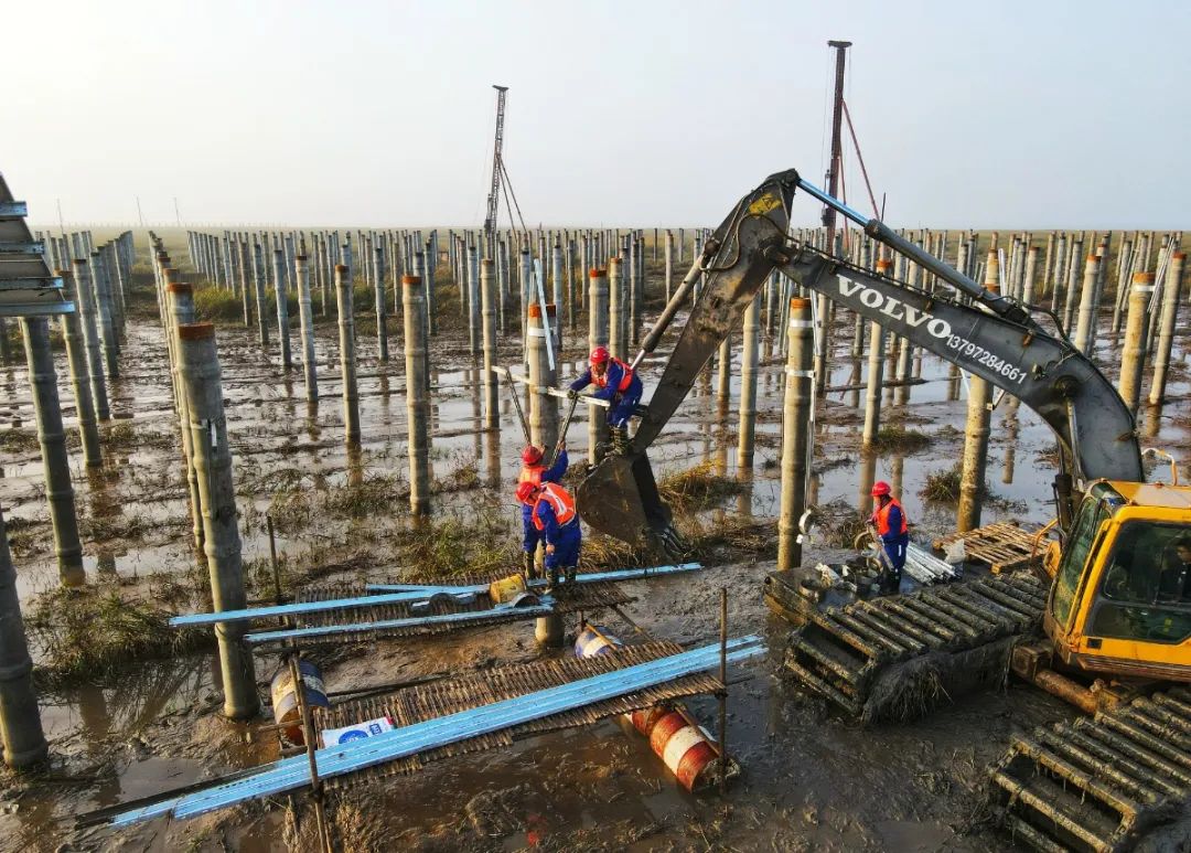 在滩涂的地质中施工难度较大,由于沉桩量大,施工速度快,桩受土体挤压影响,打的桩会左右偏移受影响。自进场以来,项目部合理安排施工计划,争分夺秒,在9月28日打下了海上的第一根光伏桩,距离合同签到仅过去14天。