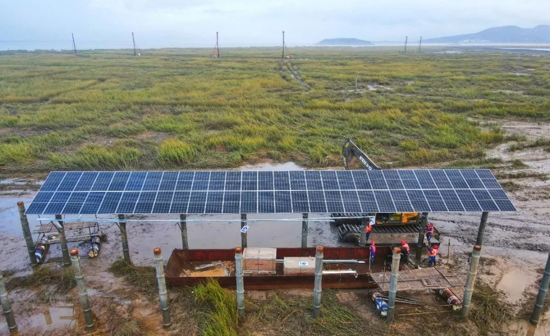 浙江象山长大涂光伏项目位于浙江省宁波市象山县高塘岛乡海域,是水电十二局承建的最大光伏项目,也是第一个滩涂光伏项目。整个光伏电站占用水面面积约4516 亩,装设685216块440瓦单晶硅光伏组件,装机容量为300兆瓦,并新建一座220千伏升压站。