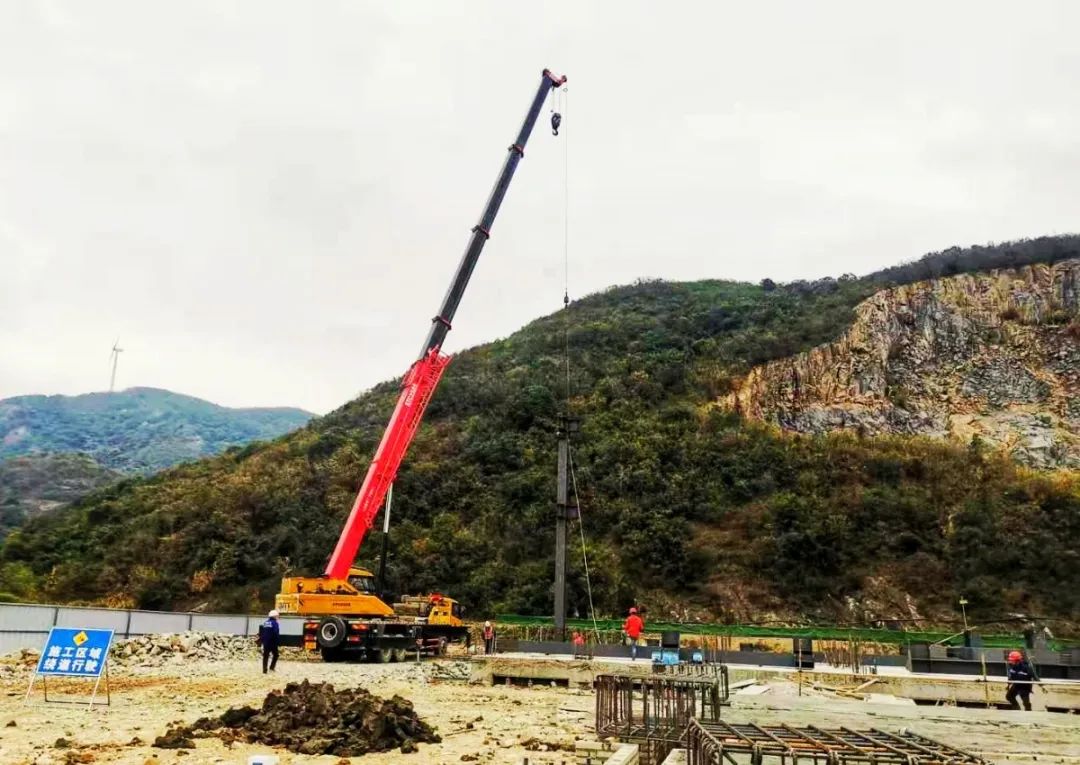 紧张的升压站地面回填工作后,10月25日,升压站第一根钢结构立柱已开始吊装。