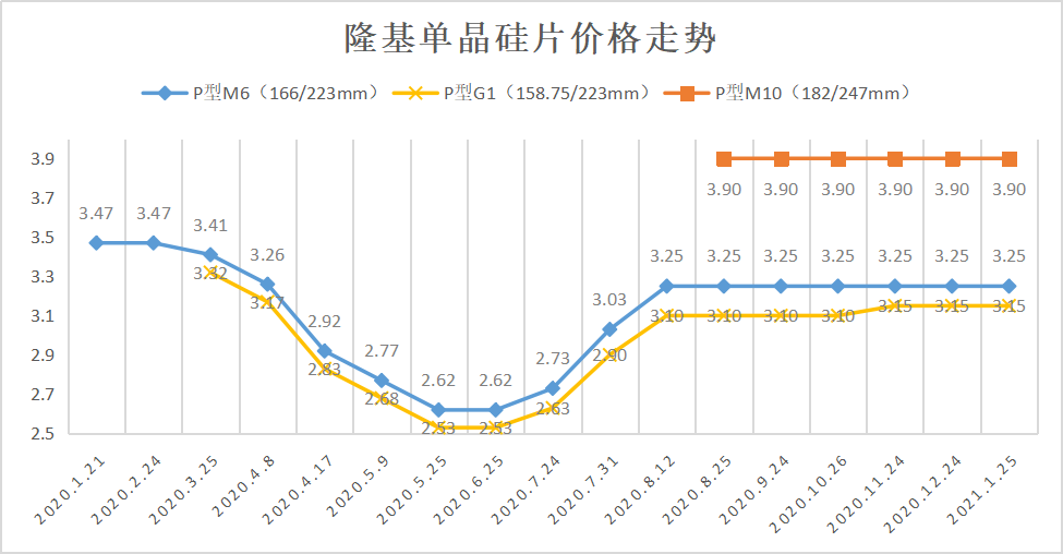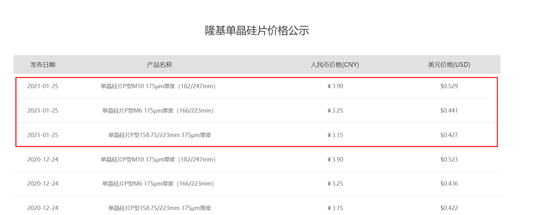 2021年1月25日,隆基股份官网公布了最新的单晶硅片价格,其中P型M10 175μm厚度(182/247mm)最新报价为3.90元/片,P型M6 175μm厚度(166/223mm)最新报价为3.25元/片,P型158.75/223mm 175μm厚度最新报价为3.15元/片,均与上月报价相同。
