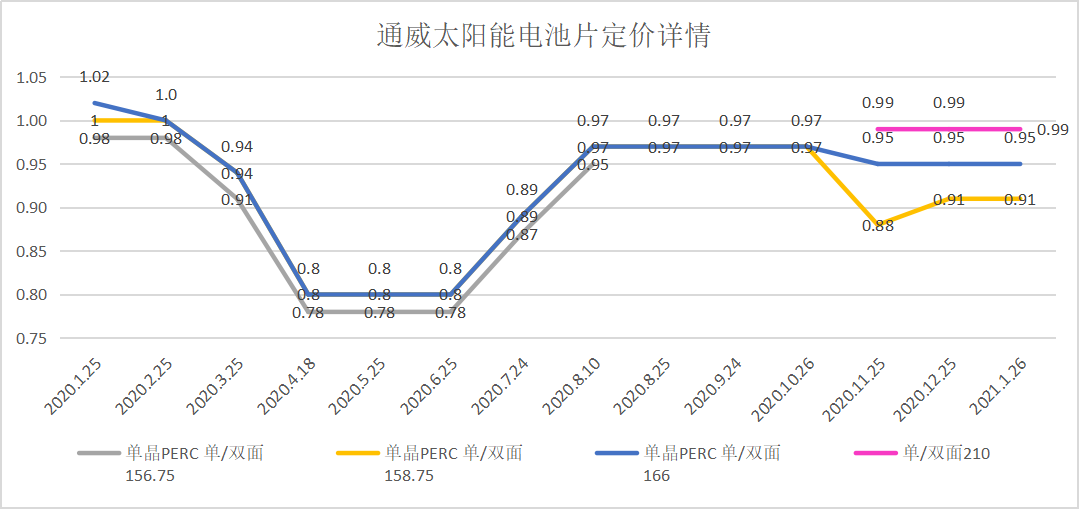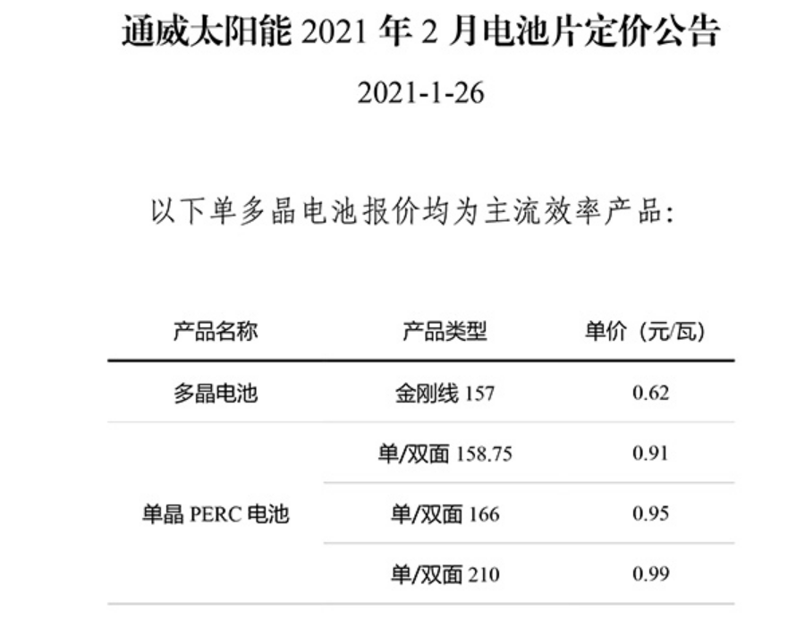 2021年1月26日,通威太阳能发布2021年2月电池片定价公告,与上月定价保持一致。多晶电池金刚线157定价0.62元/瓦,单晶PERC电池单/双面158.75定价0.91元/瓦,单晶PERC电池单/双面166定价0.95元/瓦;单晶PERC电池单/双面210定价0.99元/瓦。