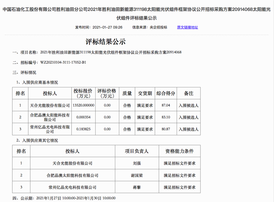 近日,中国石油化工股份有限公司胜利油田分公司2021年胜利油田新能源311198太阳能光伏组件集采进行了中标候选人公示,天合、晶澳、亿晶光电入围集采名单。