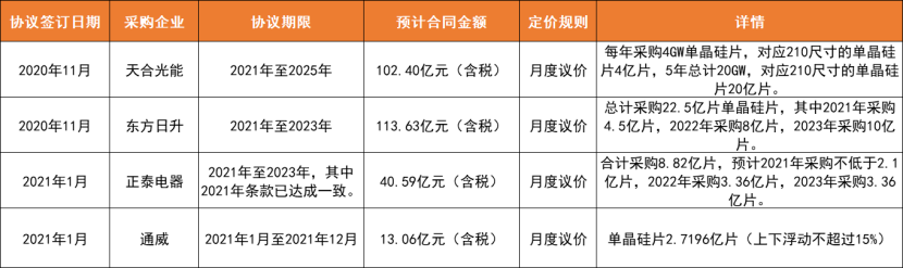 根据合同内容,合同采取月度议价方式进行,合同履行期限为2021年1月至2021年12月。本合同预计2021年销售单晶硅片2.7196亿片(上下浮动不超过15%)。参照