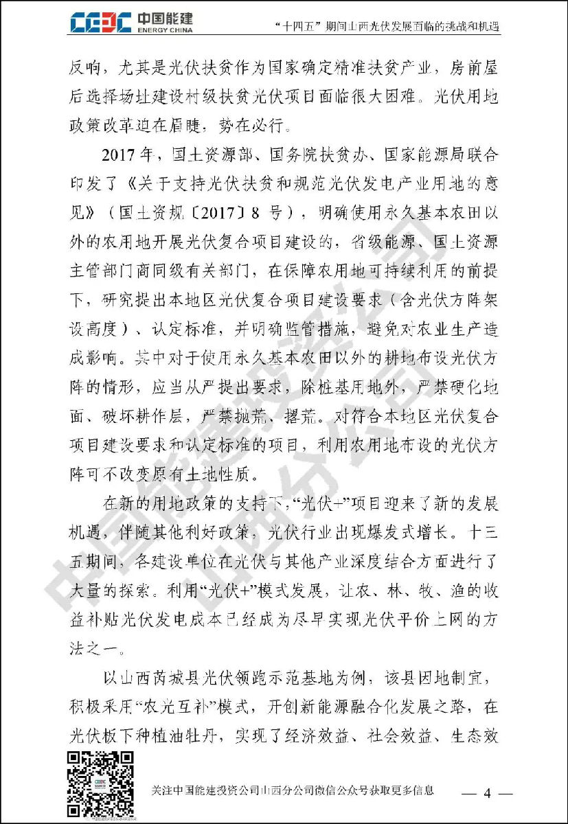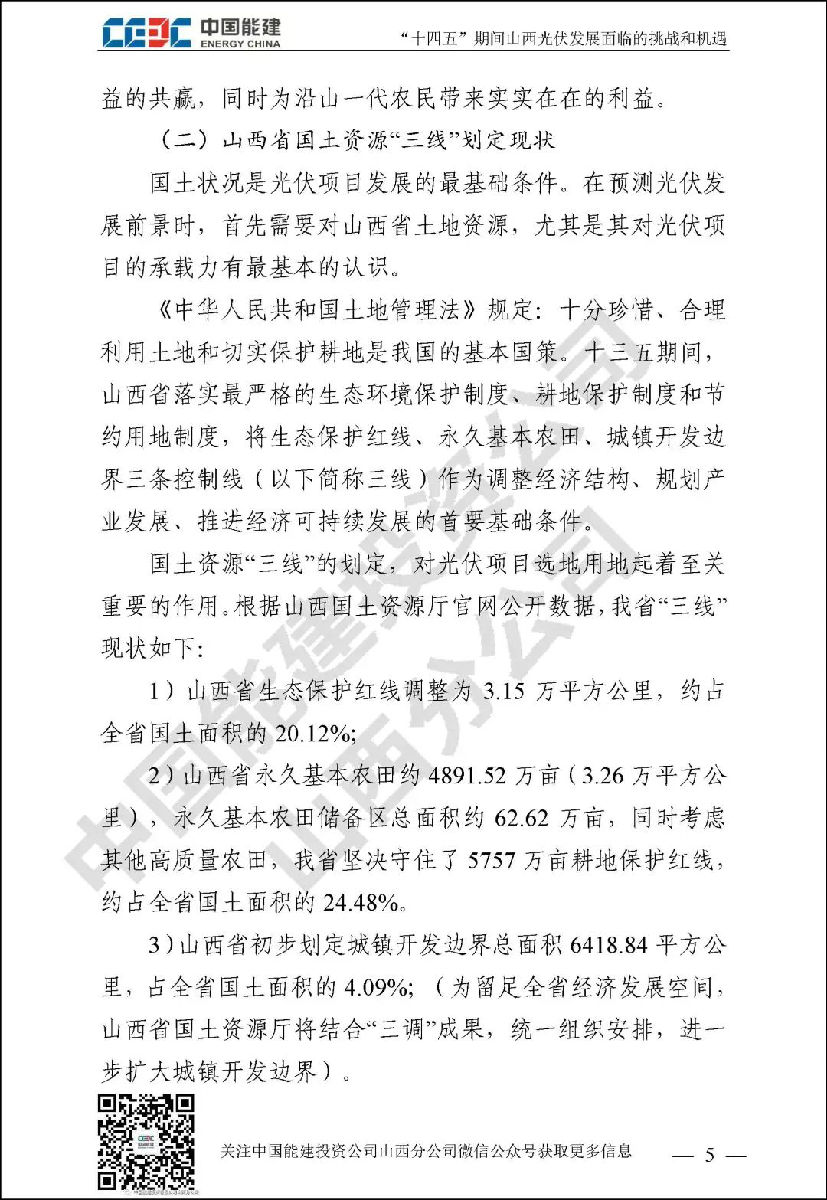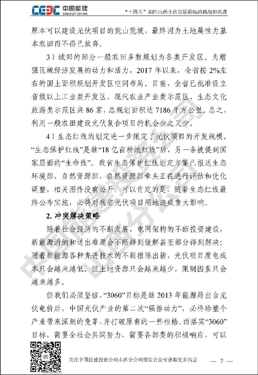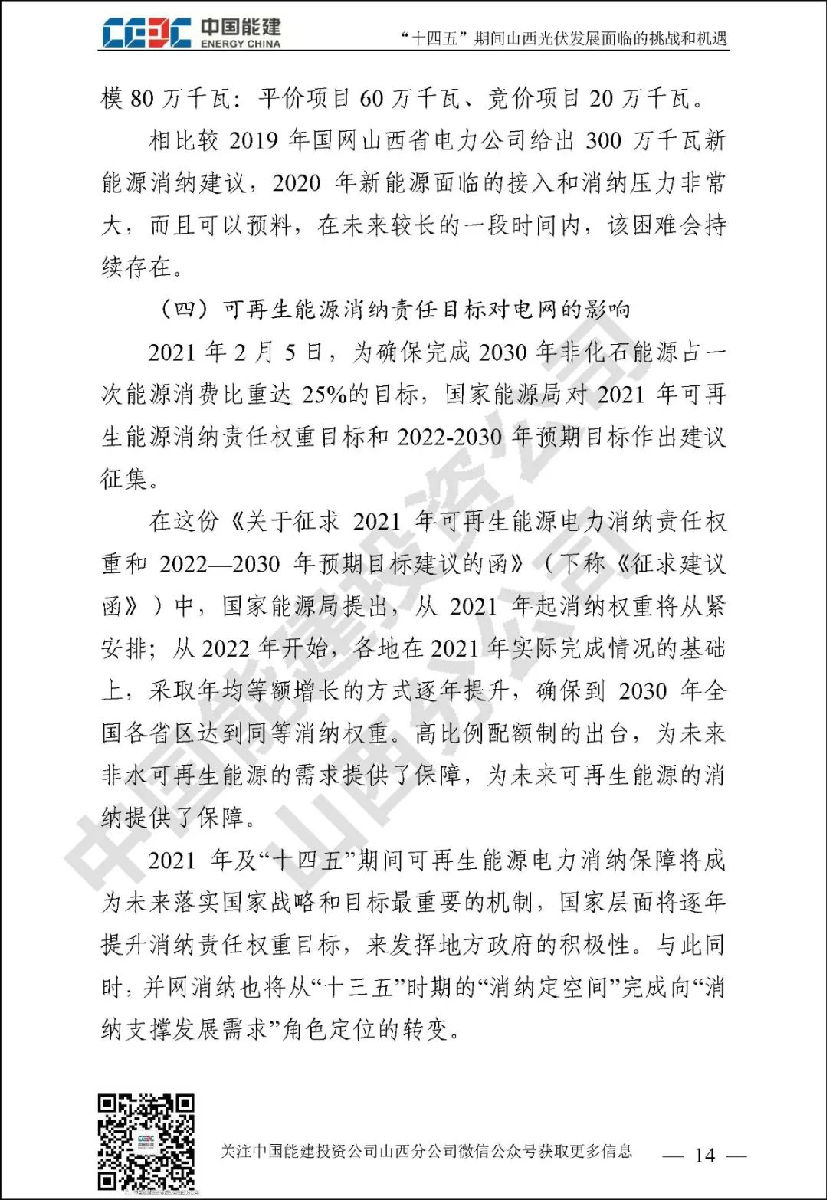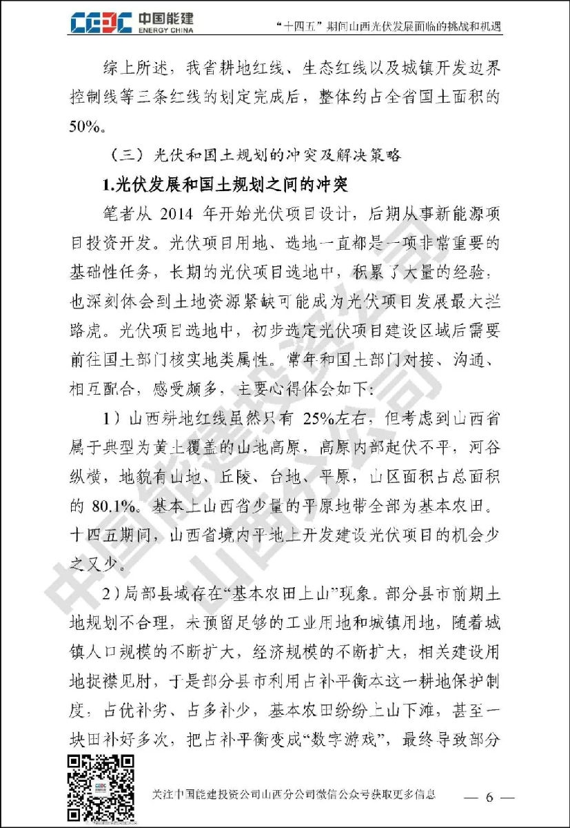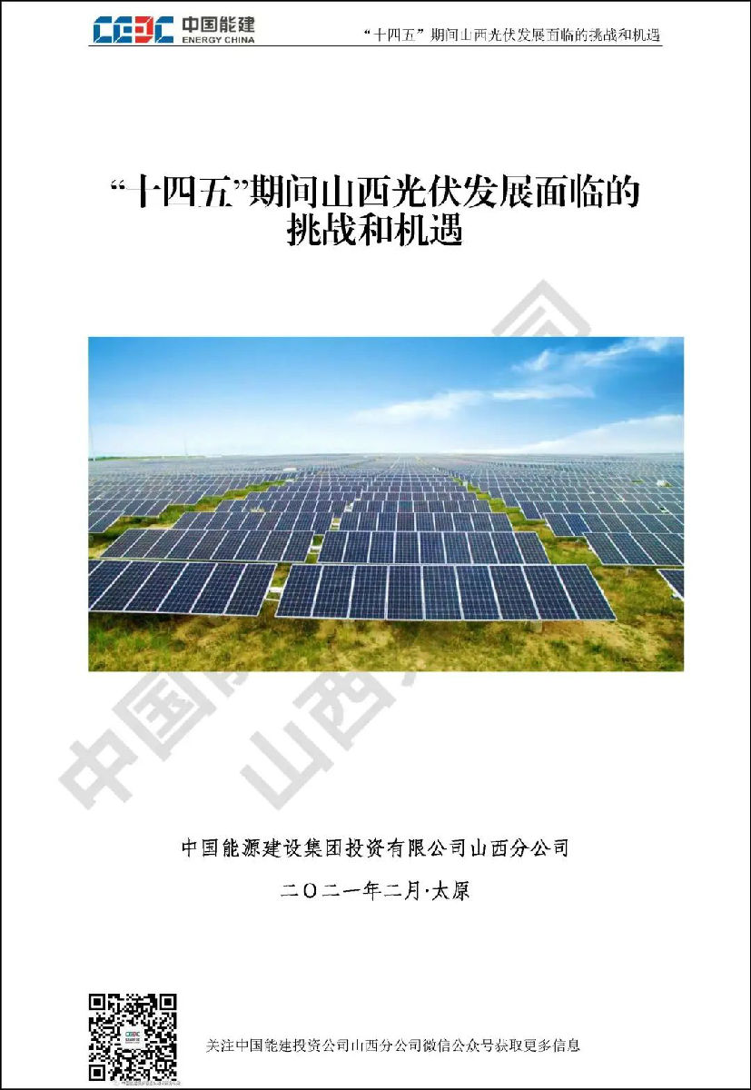 山西作为我国绝对的电力大省,“十三五”期间新能源发展成绩瞩目。“碳达峰”和“碳中和”目标对山西新能源行业发展既是挑战更是机遇。中国能建投资公司山西分公司通过对诸多和光伏未来发展相关的政府规划、行业政策、关键数据进行归纳整理,并进行分析研究,针对“土地和消纳土地资源紧缺和电网消纳困难”已经成为光伏发展最大拦路虎这一行业共识,结合新能源行业现状,对“十四五”期间山西光伏发展面临的挑战和机遇进行了详细阐述。
