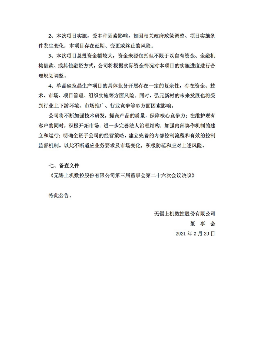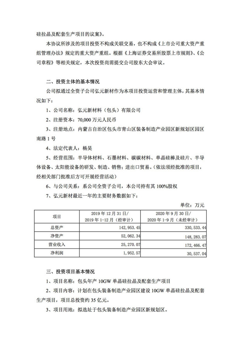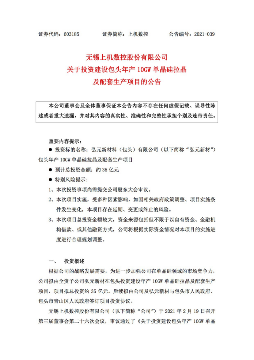 2月20日,上机数控发布公告称旗下子公司鸿元新材料将在包头新扩年产 10GW 单晶硅拉晶及配套生产项目,总投资35亿元。
