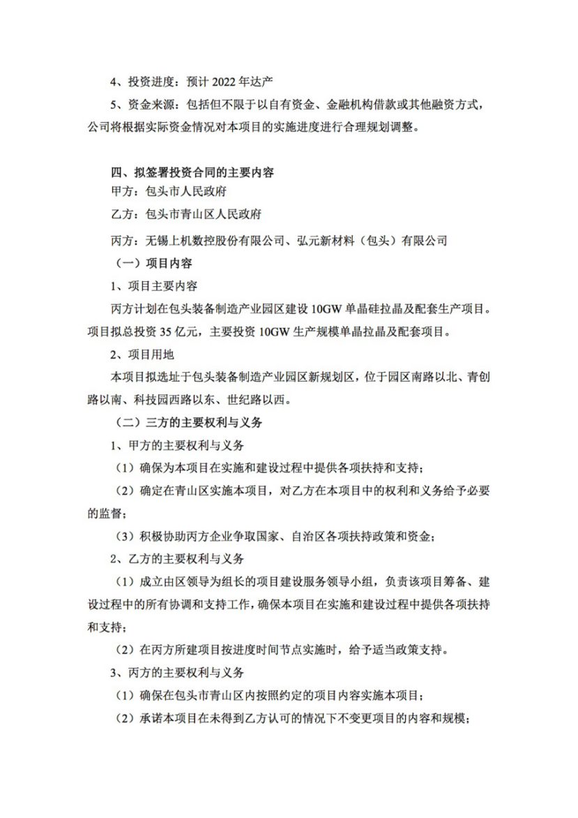 公告披露,根据上机数控的战略发展需要,为进一步加强公司在单晶硅领域的市场竞争力,公司拟由全资子公司弘元新材在包头装备制造产业园区建设10GW单晶硅拉晶及配套生产项目,项总投资约35亿元,项目计划于2022年建成投产。