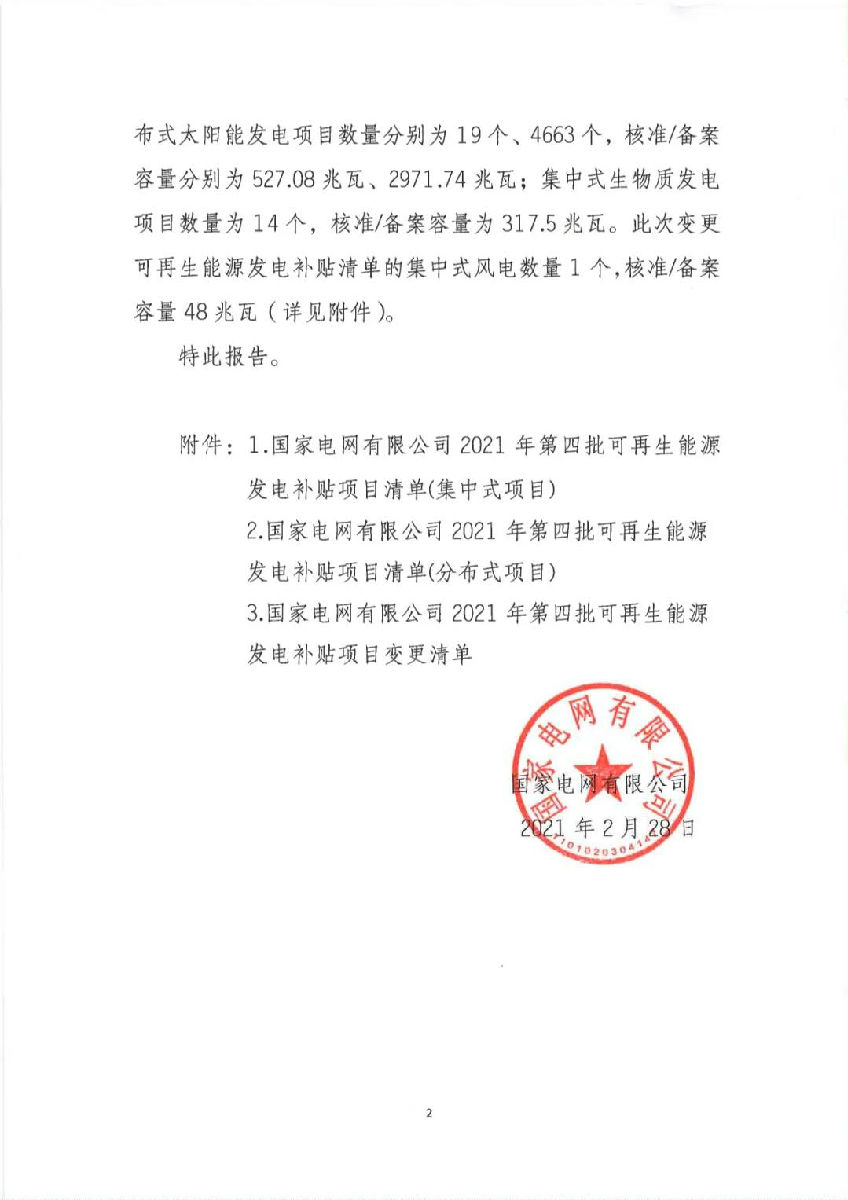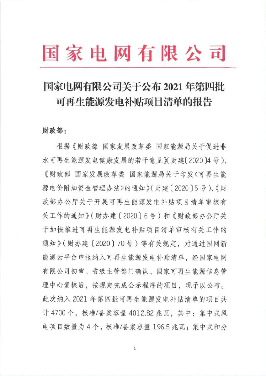 根据《财政部 国家发展改革委 国家能源局关于促进非水可再生能源发电健康发展的若干意见》(财建〔2020〕4号)、《财政部 国家发展改革委 国家能源局关于印发<可再生能源电价附加资金管理办法>的通知》(财建〔2020〕5号)、《财政部办公厅关于开展可再生能源发电补贴项目清单审核有关工作的通知》(财办建〔2020〕6号)和《财政部办公厅关于加快推进可再生能源发电补贴项目清单审核有关工作的通知》(财办建〔2020〕70号)等有关规定,国家电网有限公司积极配合各省级能源主管部门和国家可再生能源信息管理中心,为符合中央财政补助条件的可再生能源发电项目提供补贴清单申报服务。2021年2月28日,我公司已将完成公示的2021年第四批可再生能源发电项目补贴项目清单上报国家主管部门,第四批项目清单及后续项目审核进展情况,请登录新能源云平台查询。