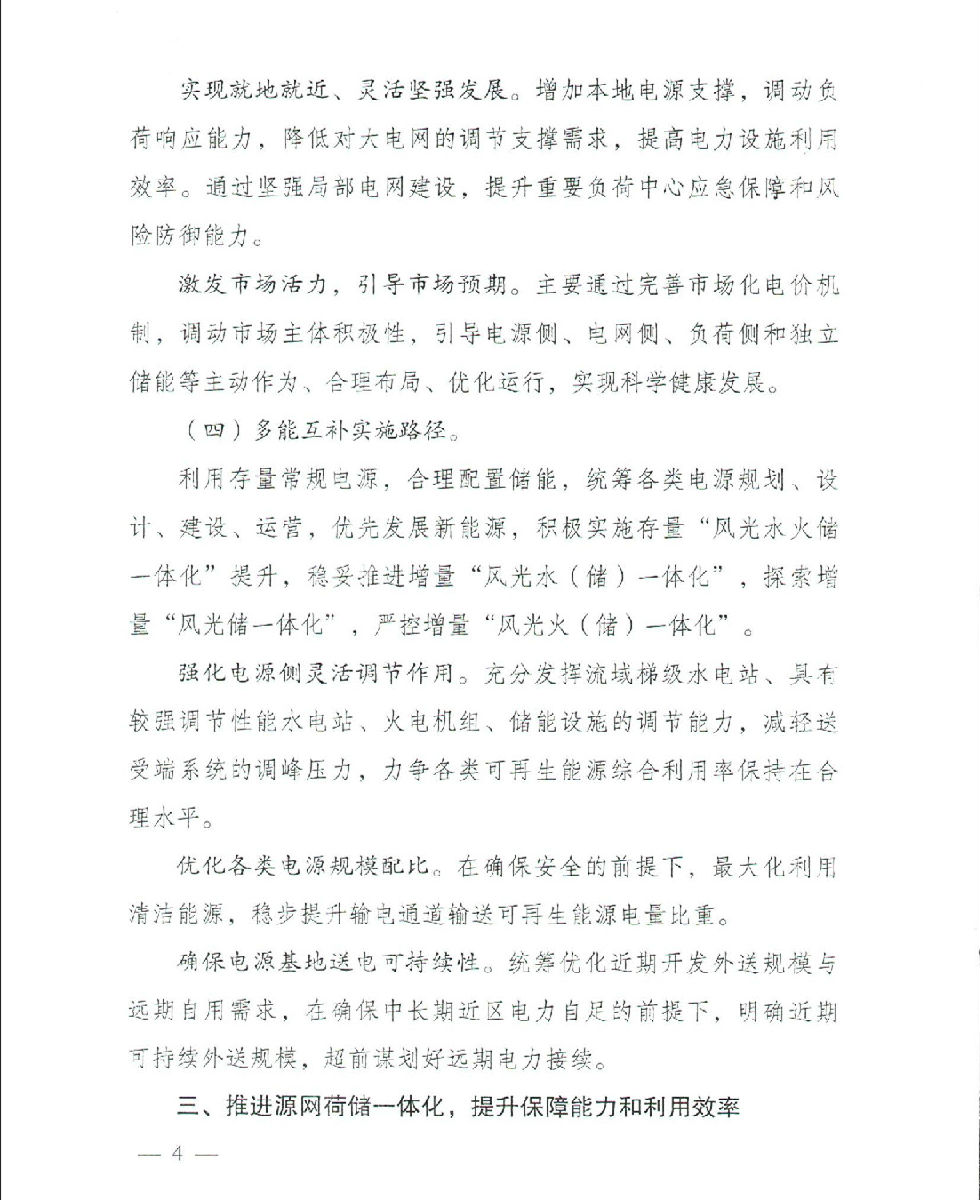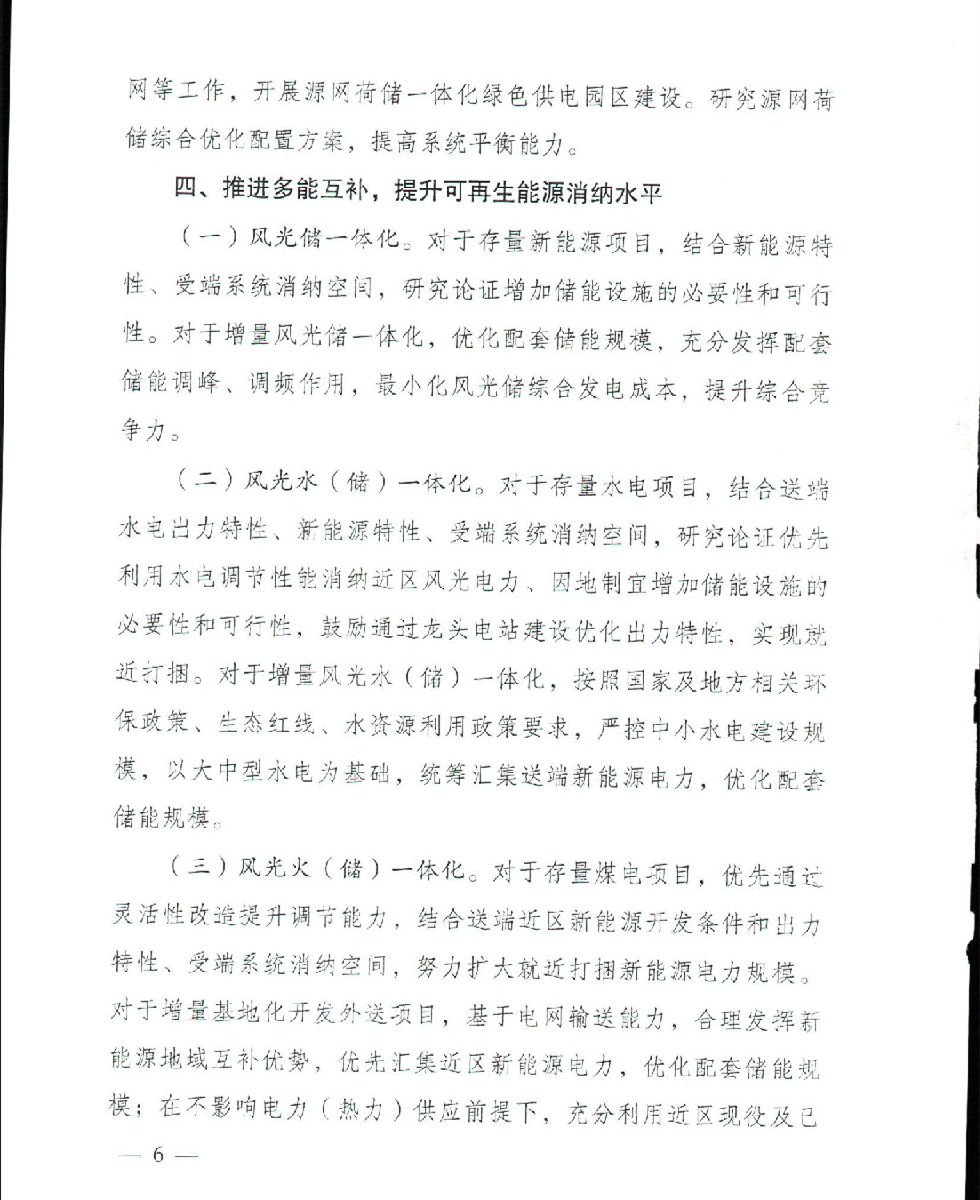 风光水(储)一体化。对于存量水电项目,结合送端水电出力特性、新能源特性、受端系统消纳空间,研究论证优先利用水电调节性能消纳近区风光电力、因地制宜增加储能设施的必要性和可行性,鼓励通过龙头电站建设优化出力特性,实现就近打捆。对于增量风光水(储)一体化,按照国家及地方相关环保政策、生态红线、水资源利用政策要求,严控中小水电建设规模,以大中型水电为基础,统筹汇集送端新能源电力,优化配套储能规模。