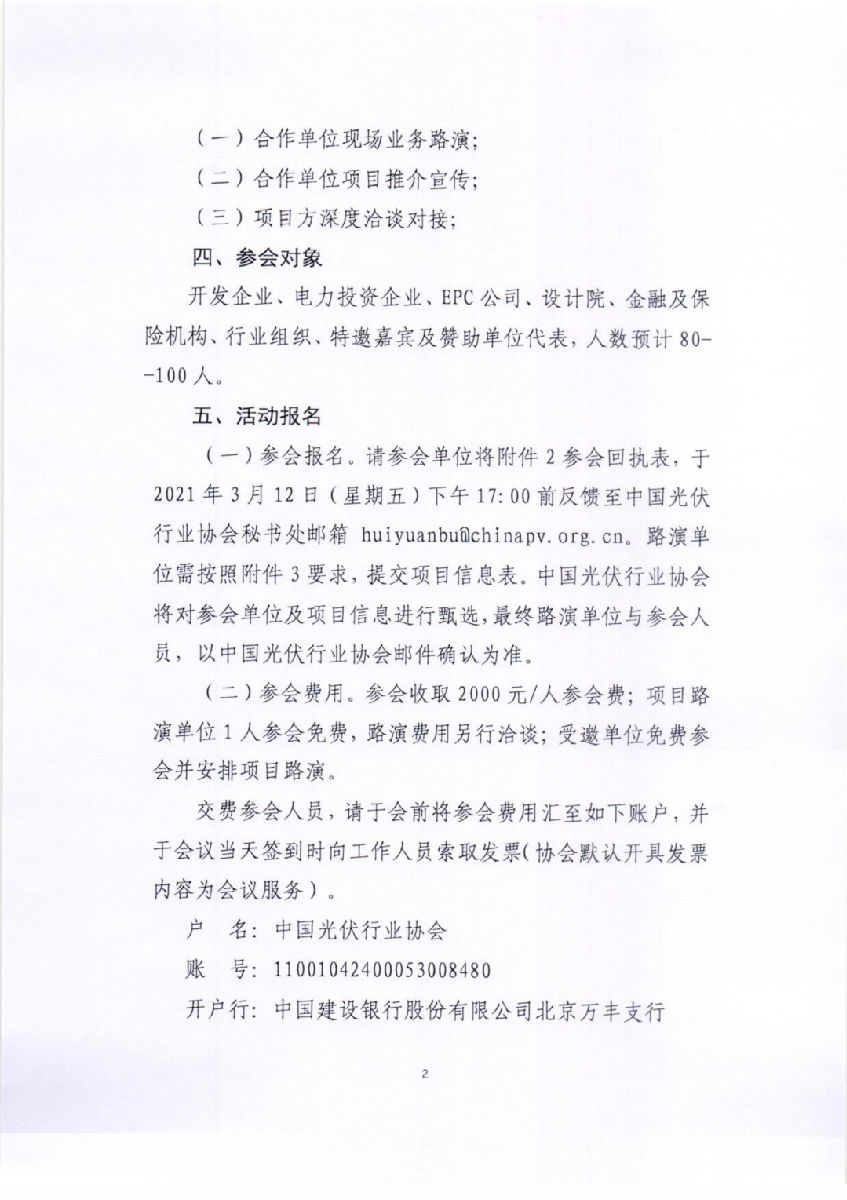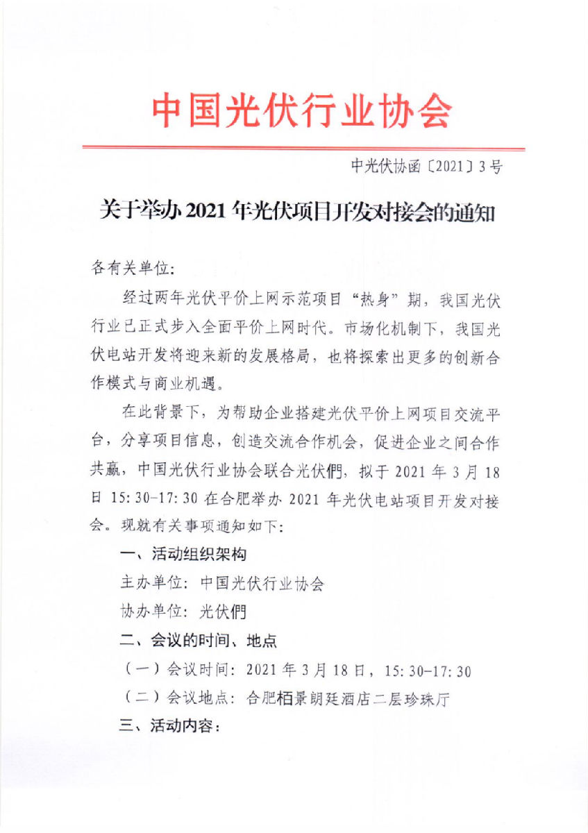 为了帮助更多的投资商、开发商、EPC企业、设计院以及金融、保险机构等获取资源,挖掘创新合作模式,中国光伏行业协会联合光伏們搭建了一个相互交流、资源共享的平台——2021年光伏项目开发对接会。
