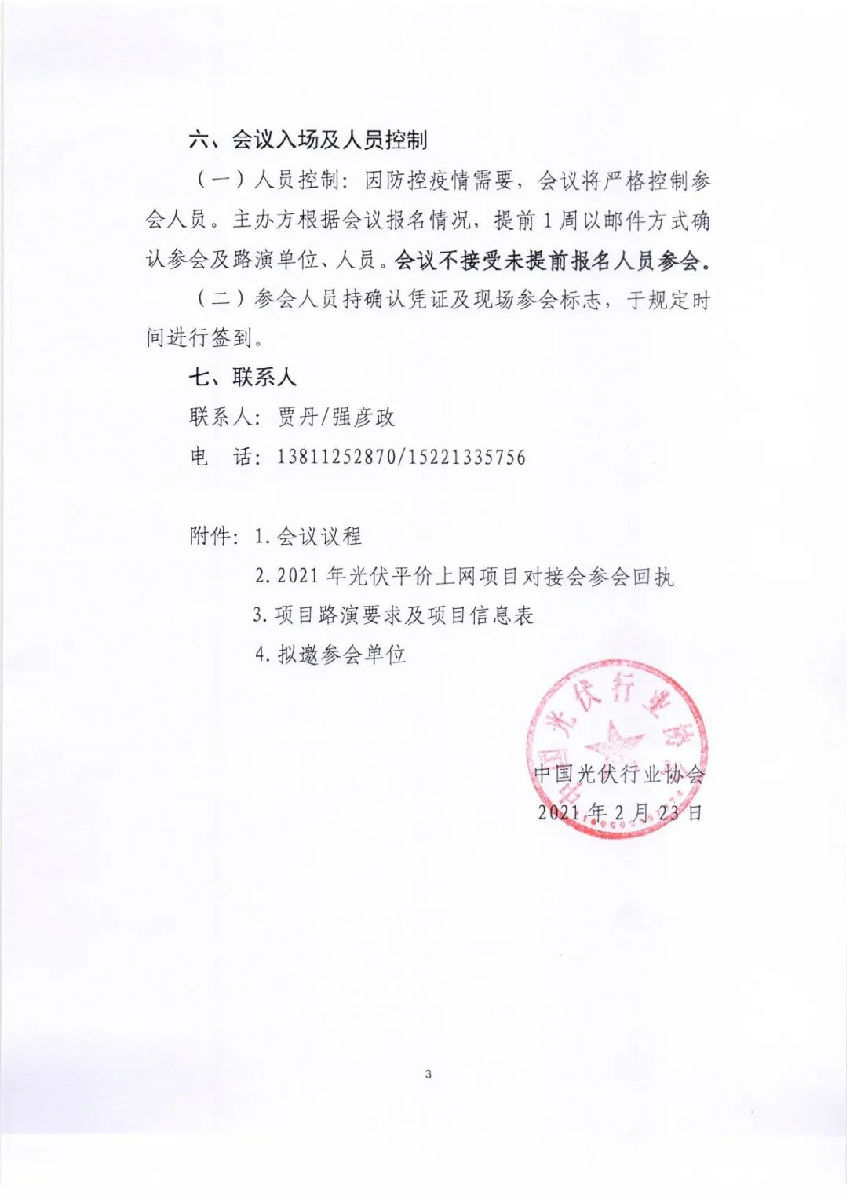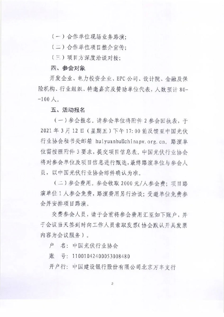 在此背景下,为帮助企业搭建光伏平价上网项目交流平台,分享项目信息,创造交流合作机会,促进企业之间合作共赢,中国光伏行业协会联合光伏們拟于2021年3月18日15:30—17:30在合肥举办2021年光伏电站项目开发对接会,逾40家电力央国企主管代表将参加本次交流会议。会议有关事项通知如下: