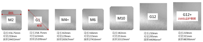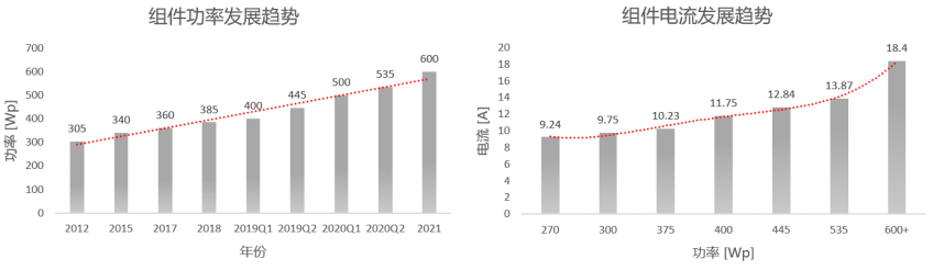 自2019年来,基于大尺寸硅片的高功率组件成为光伏行业的主流趋势,各个组件厂家纷纷将以182mm、210mm为典型尺寸的大硅片组件推入市场,硅片尺寸变大直接导致组件电流的提升。如下图所示,对于182mm以下尺寸的组件,电流提升并不明显,但当硅片尺寸增加至210mm时,组件电流从10A迅速提升至18A左右。