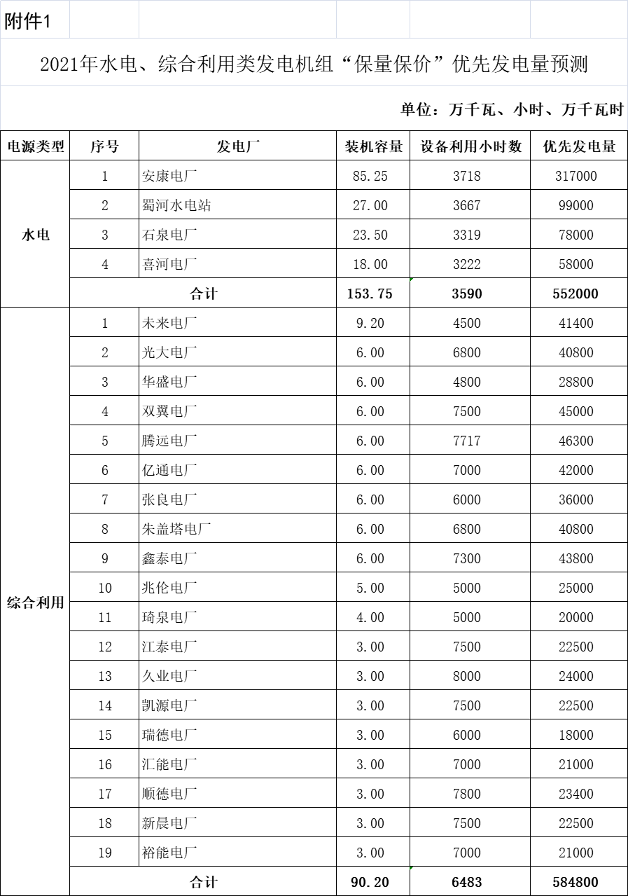 2021年,安排“保量保价”电量695亿千瓦时。其中:水电发电量100亿千瓦时(统调机组55亿千瓦时、地方小水电45亿千瓦时),风电、光伏245亿千瓦时,综合利用机组58亿千瓦时,火电292亿千瓦时(保量保价计划280亿千瓦时、小火电12亿千瓦时)。预计“保量竞价”电量完成547亿千瓦时(风电、光伏40亿千瓦时、火电507亿千瓦时),通过参与市场化交易“优先出清”方式予以保障。