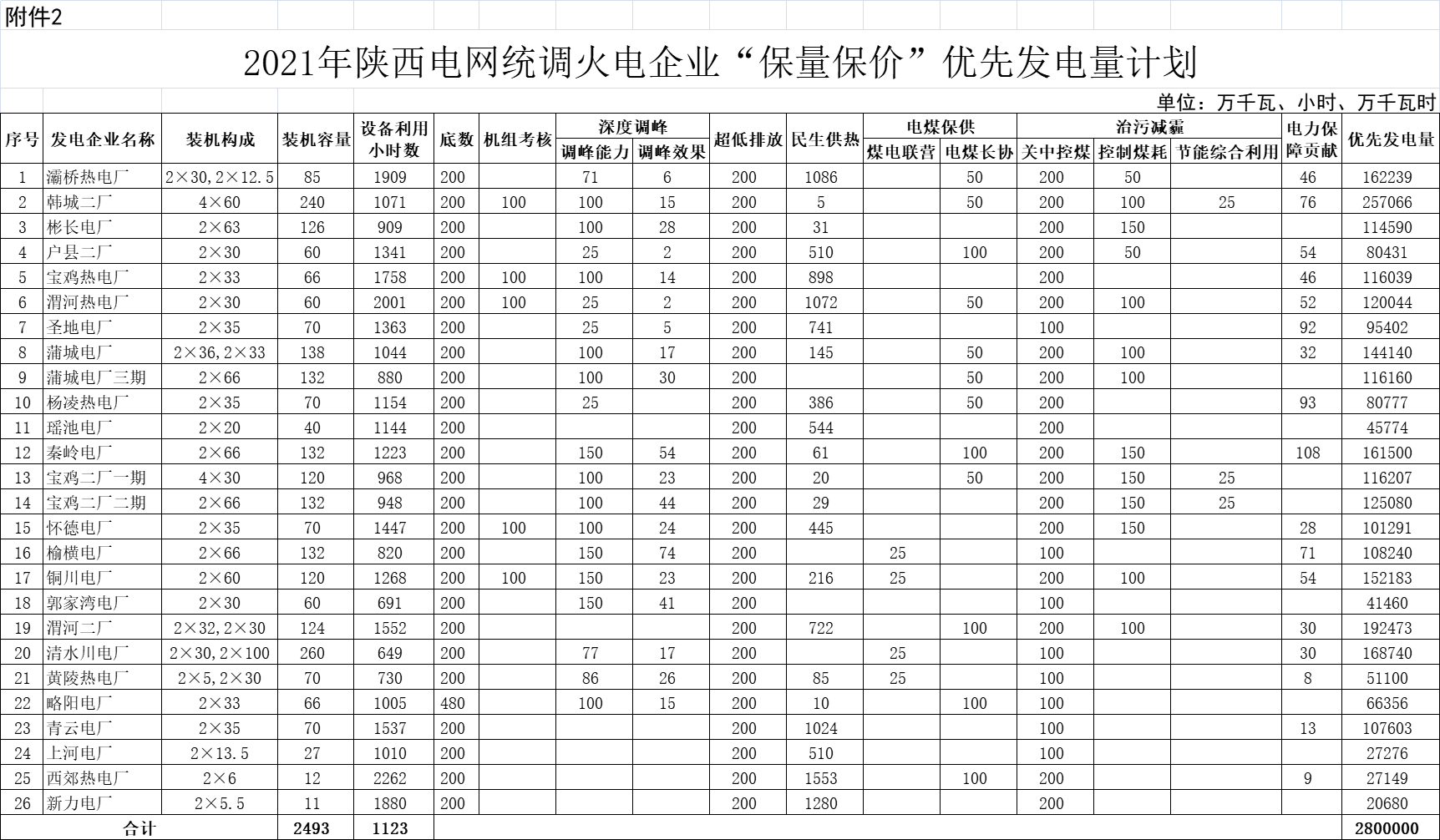 3. 陕西电网统调火电企业“保量保价”装机容量2493万千瓦,制定“保量保价”优先发电量计划280亿千瓦时,设备平均利用小时数1123小时(详见附件2)。