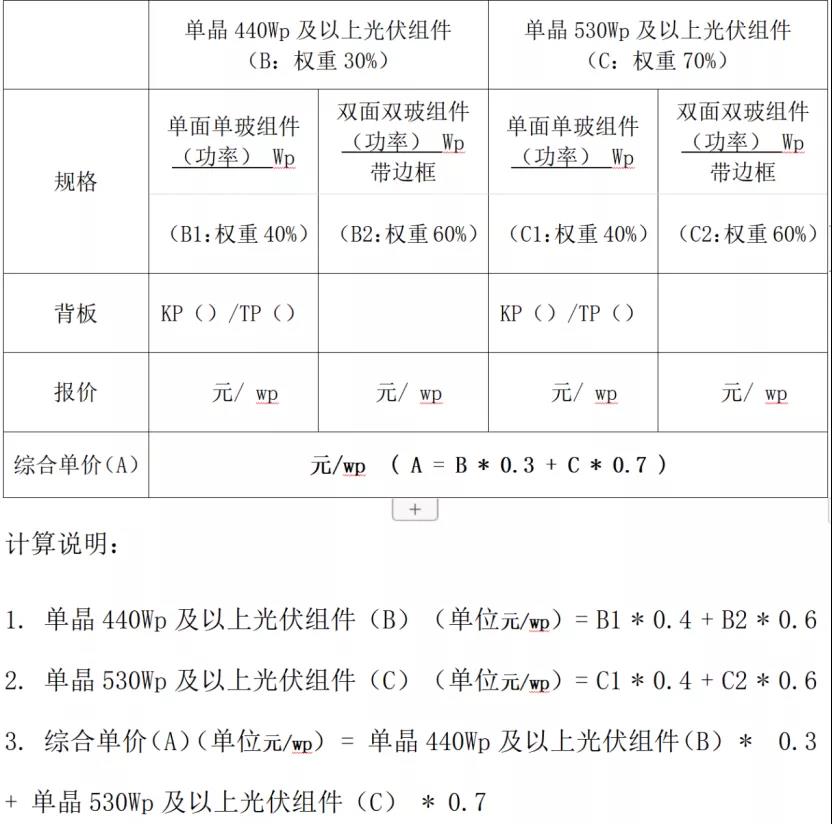 与去年类似的是,今年大唐集团仍然采用了综合单价作为价格评分方式,如下图,综合单价(A)(单位元/wp) = 单晶440Wp及以上光伏组件(B) * 0.3 + 单晶530Wp及以上光伏组件(C) * 0.7。