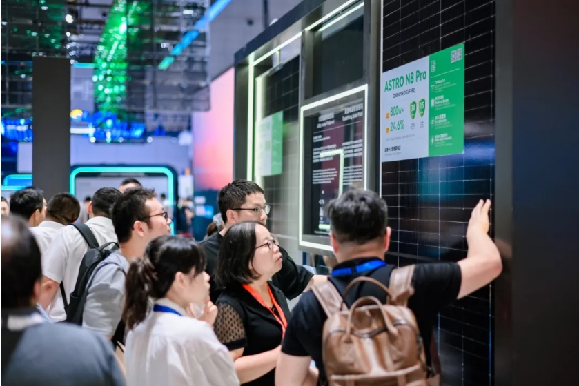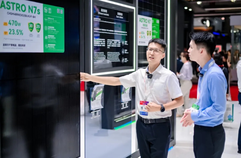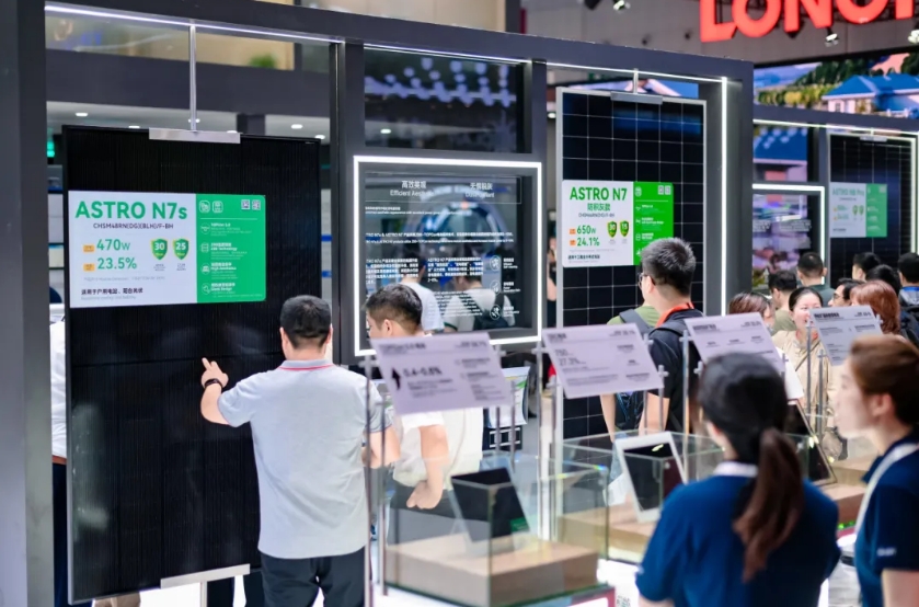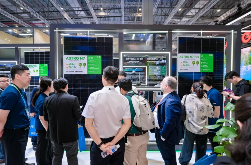 在今年的SNEC展会中,主力旗舰产品ASTRO N7吸引众多关注。ASTRO N7凭借210R矩形硅片与TOPCon 5.0电池技术的融合,最高效率达24.1%,成为多场景应用的量产主力产品。其创新的2382×1134mm尺寸设计实现集装箱空间利用率98.5%,有效降低运输成本;低开压设计提升单串组串功率,综合降低BOS成本及LCOE。