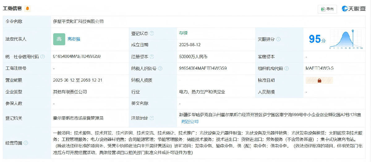 8月12日,伊犁平美和汇科技有限公司成立,法定代表人为高志强,注册资本为5亿元。