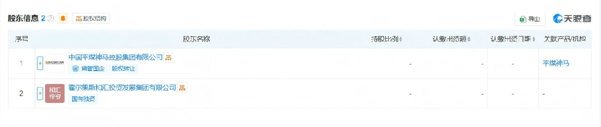 股权穿透显示,该公司由霍尔果斯和汇投资发展集团有限公司、中国平煤神马控股集团有限公司共同持股。前者为新疆霍尔果斯经济开发区伊宁园区国有资产管理中心100%控股公司;后者为河南国资委控股公司。