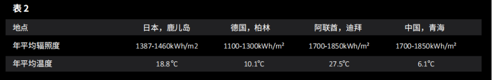 研究选择了四个典型地区展开分析,分别是日本鹿儿岛、德国柏林、阿联酋迪拜、和中国青海,各地区年平均辐照度与年平均温度如表2所示。