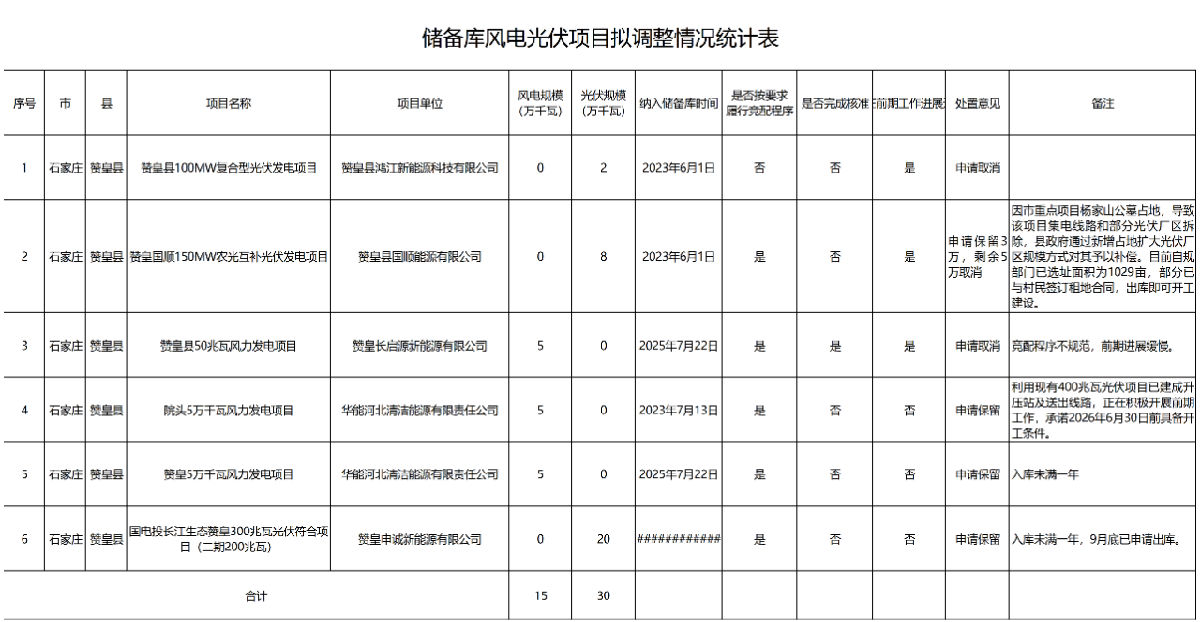 为进一步加强风电、光伏发电项目管理,我局组织对赞皇县2025年底到期风电、光伏项目和省级储备库风电、光伏项目情况进行了摸底,并结合企业投资积极性、土地资源落实情况、项目前期手续办理及施工进度等研究提出了处置意见。现将相关项目拟调整意见予以公示。具体项目名单及调整意见见附件。