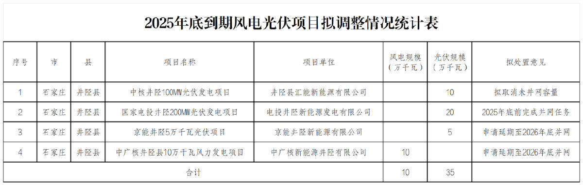 为进一步加强风电、光伏发电项目管理,我局组织对井陉县2025年底到期未建成风电光伏项目和储备库风电光伏项目情况进行了摸底,并结合企业投资积极性、土地资源落实情况、项目前期手续办理及施工进度等研究提出了处置意见。现将相关项目拟调整意见予以公示。具体项目名单及调整意见见附件。