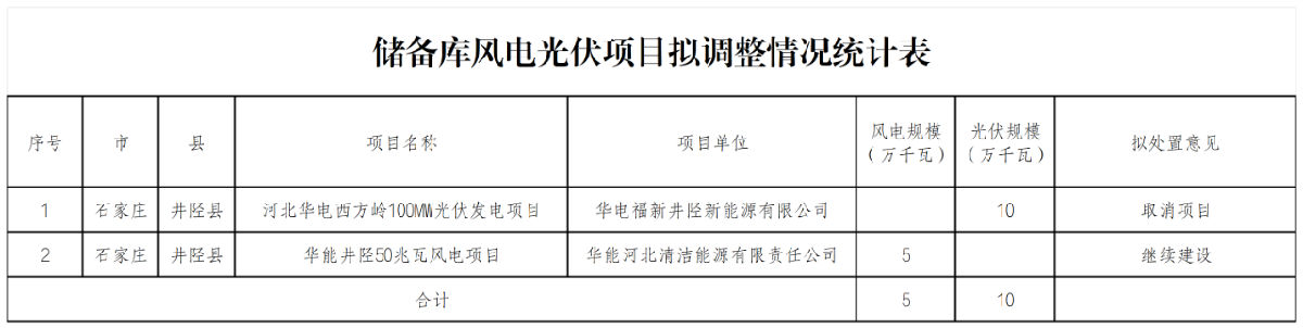河北井陉县到期和储备库风电光伏项目拟调整项目共6个,规模合计600MW,其中,风电项目150MW,光伏项目450MW,业主分别为中核、国家电投、京能、中广核、华电、华能等。