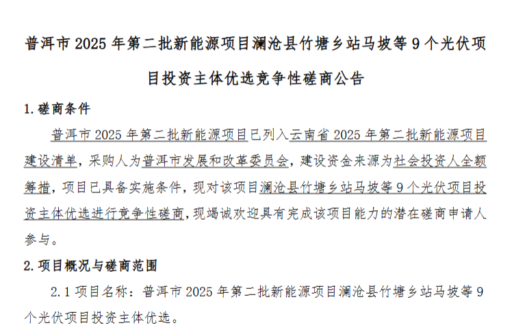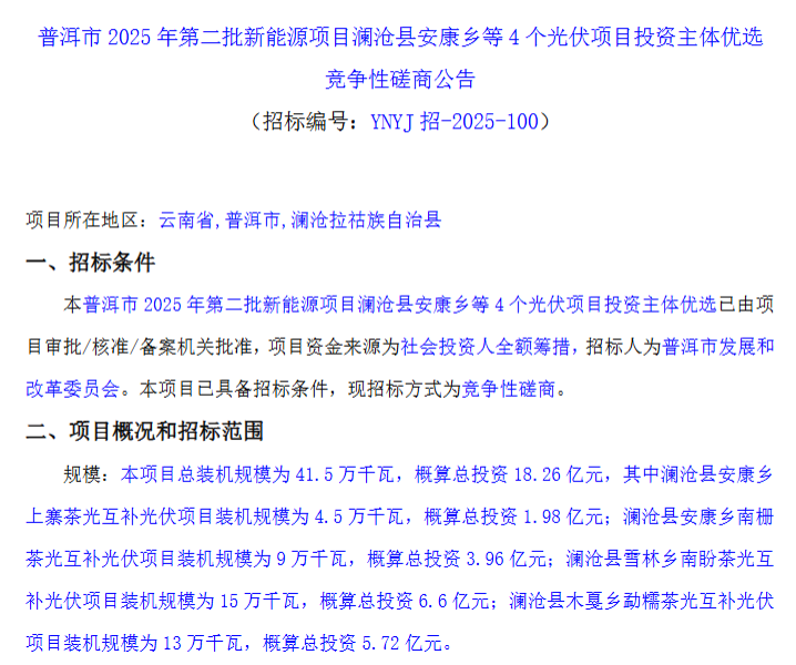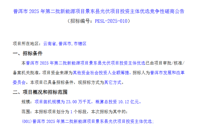 近日,云南省文山州、普洱市1480MW光伏项目启动业主优选,项目均为2025年第二批下发光伏指标