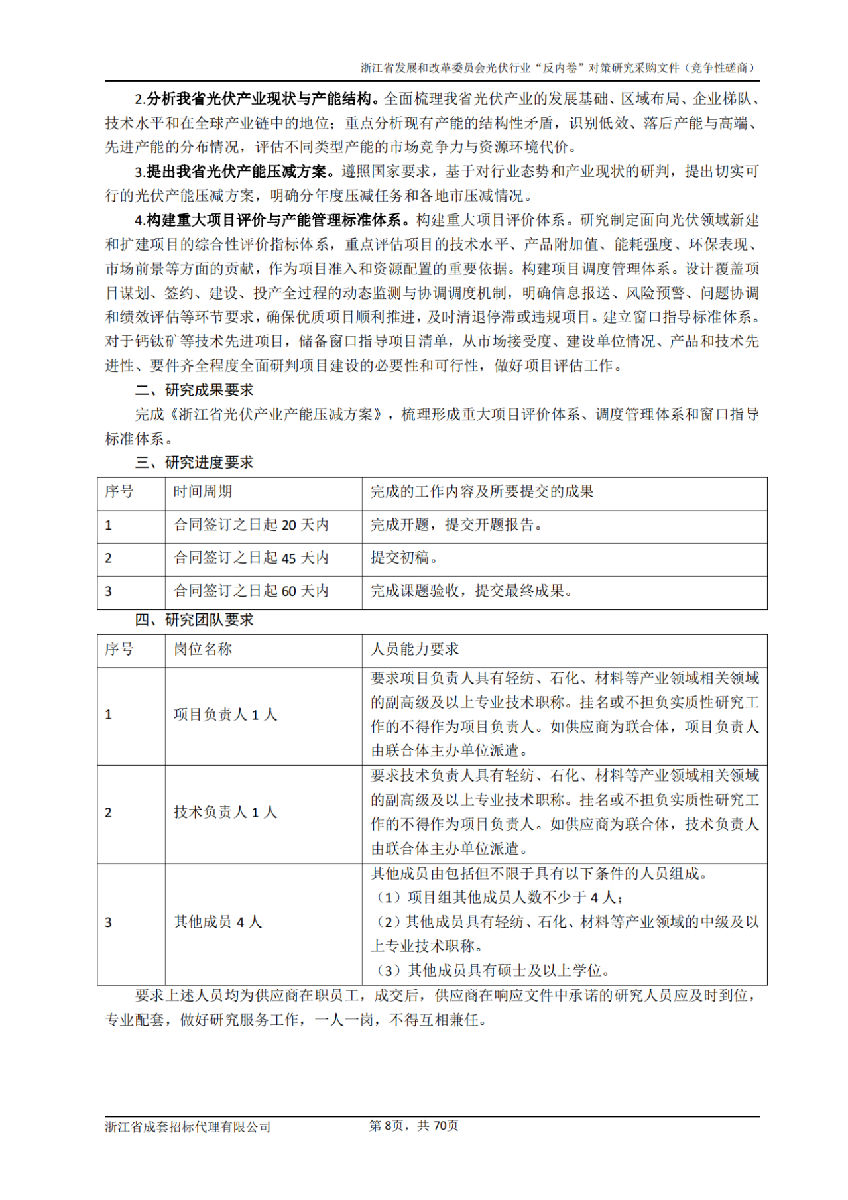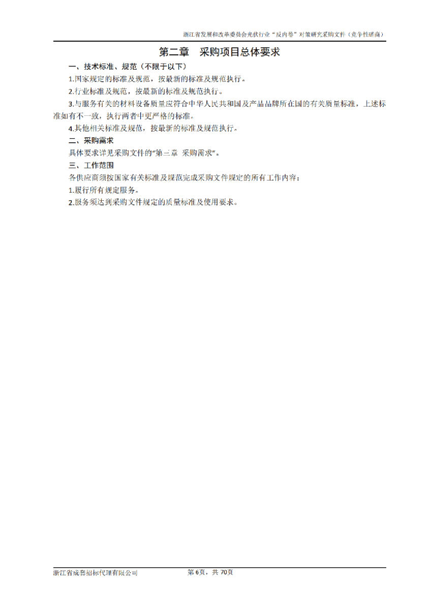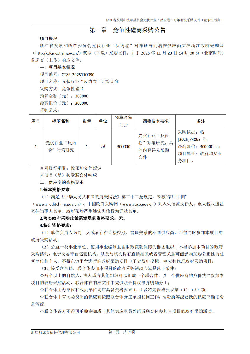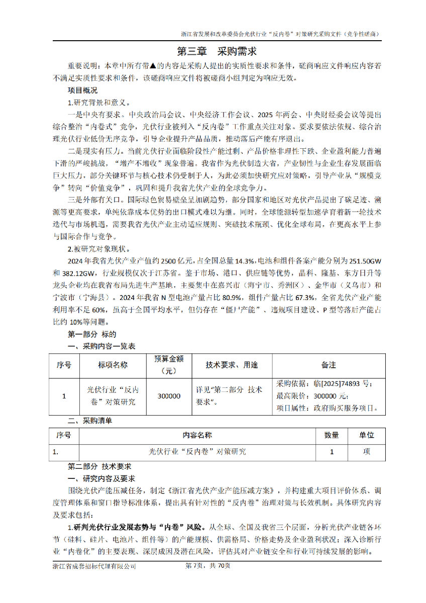 针对本次招标的研究背景和意义,浙江发改委表示,一是中央有要求。中央政治局会议、中央经济工作会议、2025年两会、中央财经委会议等提出综合整治“内卷式”竞争,光伏行业被列入“反内卷”工作重点关注对象。要求要依法依规、综合治理光伏行业低价无序竞争,引导企业提升产品品质,推动落后产能有序退出。