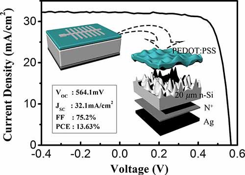 中国科学院宁波材料技术与工程研究所所属新能源技术研究所研究员叶继春团队结合自身在超薄单晶硅薄膜材料研发方面的优势,提出以20μm厚度的超薄单晶硅来构建新型n-Si/PEDOT:PSS异质结太阳能电池的研究方向并取得系列进展。与传统体硅相比,该超薄杂化异质结电池不但具有材料节约、可柔性的特点,且随着厚度的减薄,光生载流子的有效传输路径变短、体复合会受到抑制,理论上可以获得更高的开路电压,同时可以降低对硅材料质量的要求。