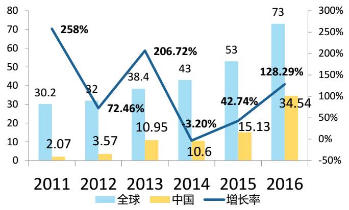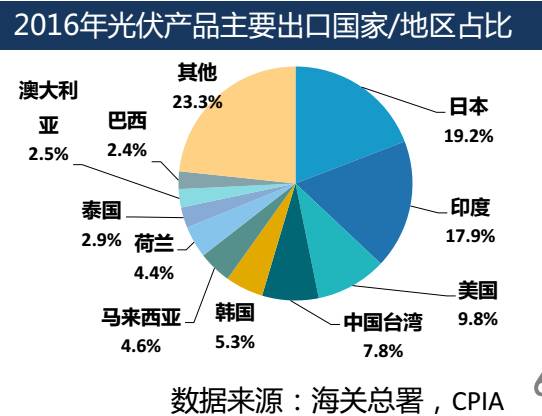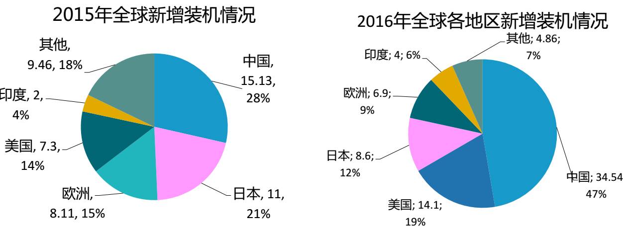 2016年全球光伏新增装机约73GW,其中中国34.54GW,美国14.1GW、日本8.6GW、欧洲6.9GW、印度4GW。欧洲和日本等传统市场的市场占比逐步向中国、美国、印度等市场转移;一批新兴市场正在加速发展。