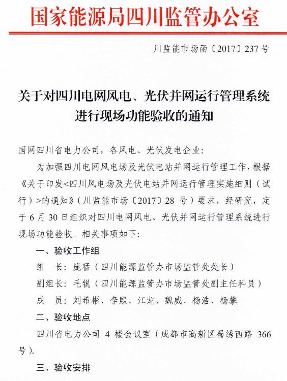 近日,国家能源局四川监管办公室发文要求,将在6月30日对所有光伏、风电电站的并网运行管理系统进行现场功能验收。全文如下: