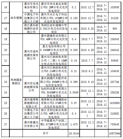 秀洲区分布式光伏发电应用示范项目财政补助资金明细表