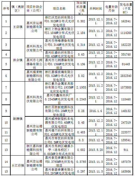 根据秀洲区人民政府办公室《关于印发秀洲区2016年度推进光伏发电应用工作实施意见的通知》(秀洲政办发〔2016〕58号)文件精神,2015年度并网发电分布式光伏发电项目和2016年并网的户用光伏发电项目补助已经区政府常务会议审议,拟对浙江沃克纺织有限公司0.302MW分布式光伏发电项目等项目进行资金补助,现予以公示。