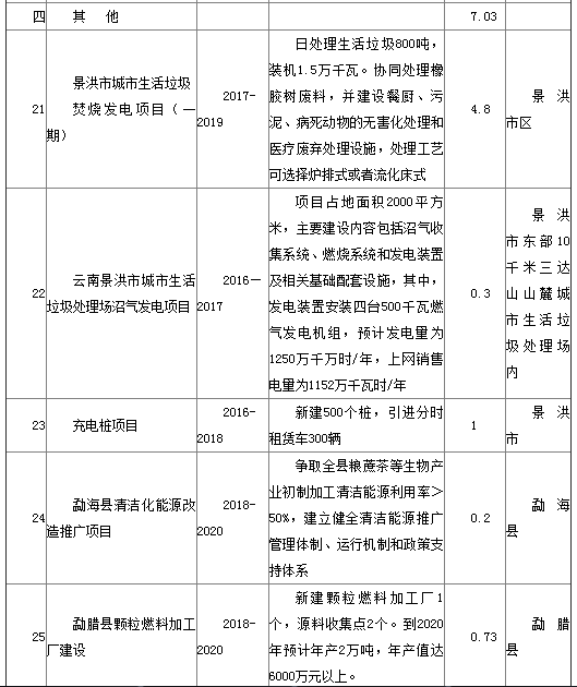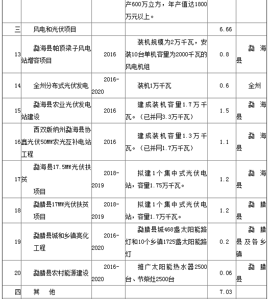 西双版纳州“十三五”期间三县市清洁能源规划项目25个,总投资93亿元(含已开工项目投资)。具体项目情况见表5。