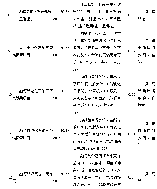 加快推进天然气支线管网建设前期工作。启动普洱至景洪天然气支线管道建设,抓紧建设储气工程设施,稳步推进LNG接收站建设,积极实施天然气基础设施工程,引导天然气高效利用,完善天然气价格形成机制,开发天然气分布式能源项目。