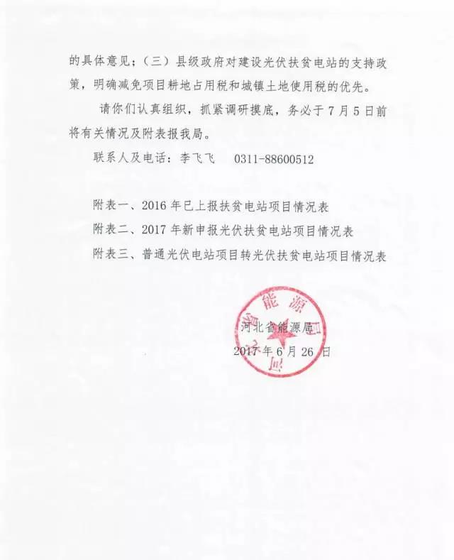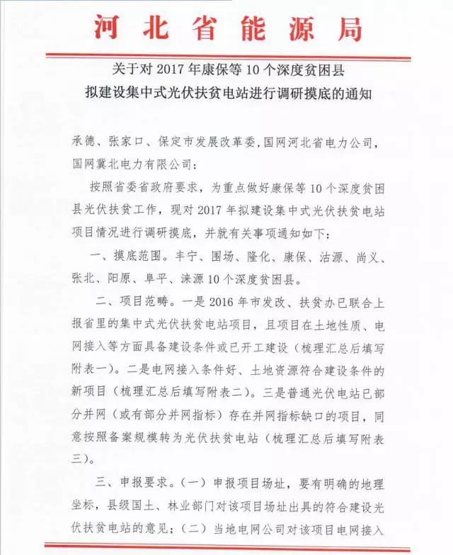 6月26日,河北省能源局发布《关于对2017年康保等10个深度贫困县拟建设集中式光伏扶贫电站进行调研摸底的通知》,文件指出,此次摸底范围包括丰宁、围场等10个深度贫困县。