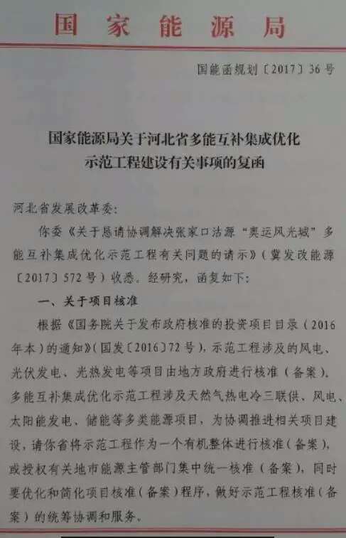近日,国家能源局向河北省发改委下发《关于河北省多能互补集成优化示范工程建设有关事项的复函》,针对河北省发改委就协调解决张家口沽源“奥运风光城”多能互补集成优化示范工程有关问题进行了回复。该复函要求河北省将示范工程作为一个有机整体进行备案,其中示范工程中的风电、太阳能发电优先使用本年度总量指标。