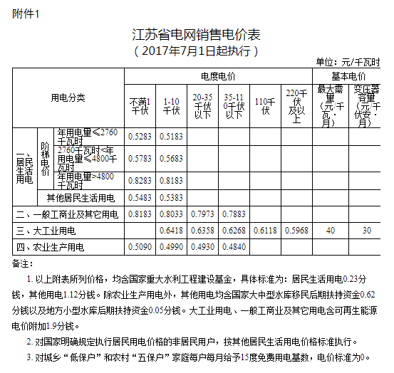 通知中指出,自2017年7月1日起,江苏省燃煤发电机组标杆上网电价上调为每千瓦时0.391元(含脱硫、脱硝和除尘电价);未执行标杆电价的其他燃煤发电机组(含自备和热电联产机组)的上网电价在现行上网电价基础上每千瓦时上调1.30分;山西阳城电厂一、二期上网电价同步上调。