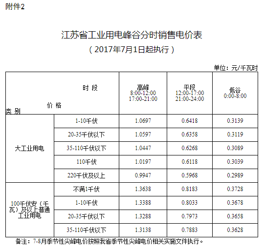 2. 江苏省工业用电峰谷分时销售电价表
