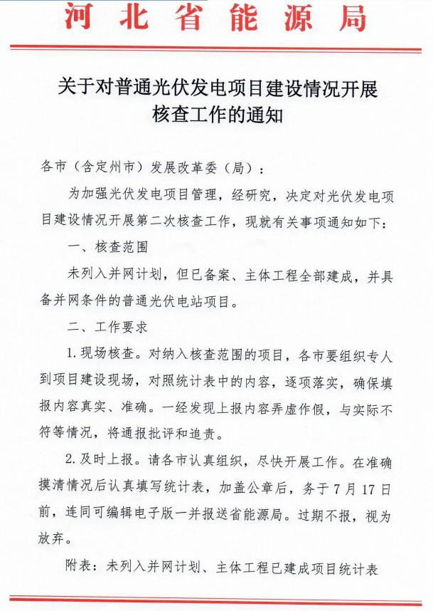 12日,河北省能源局再发通知,将开始进一步对本省未列入并网计划,但已备案且主体工程完建,并具备并网条件的普通光伏电站项目展开核查。