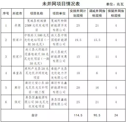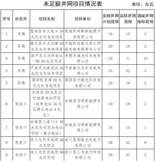 按照河北省能源局《关于对光伏发电项目开展核查摸底工作的紧急通知》和《关于组织企业出具并网承诺函的紧急通知》要求,已列入并网计划的光伏项目应于6月30日前建成并网,未并网项目(并网指标)将进行调减。经省级电网公司确认、网上公示和核实,现对未按要求并网的普通光伏发电项目(并网指标)予以调减,并将有关事项通知如下: