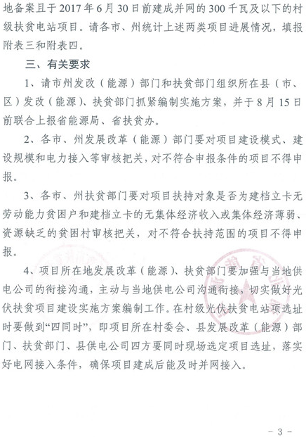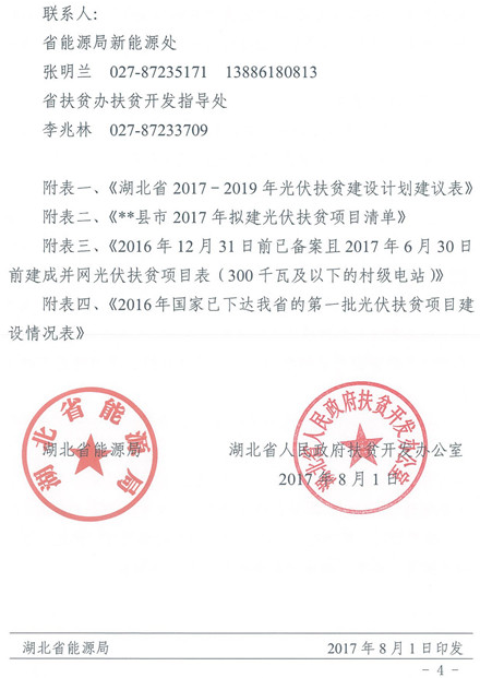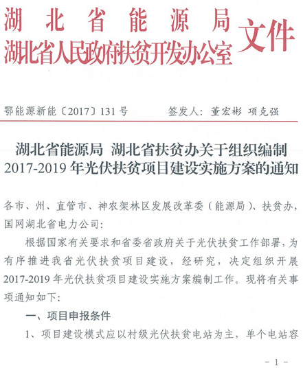 8月1日,湖北省能源局、湖北省扶贫办联合下发了《组织编制2017-2019年光伏扶贫项目建设实施方案的通知》,通知要求湖北省光伏扶贫项目要以村级光伏扶贫电站为主要建设模式,单个电站容量控制在300千瓦以内,不具备单独建设村级电站条件的地区,可适度建设多村联建集中式光伏扶贫电站(单个多村联建集中式光伏扶贫电站规模控制在6兆瓦以内)。
