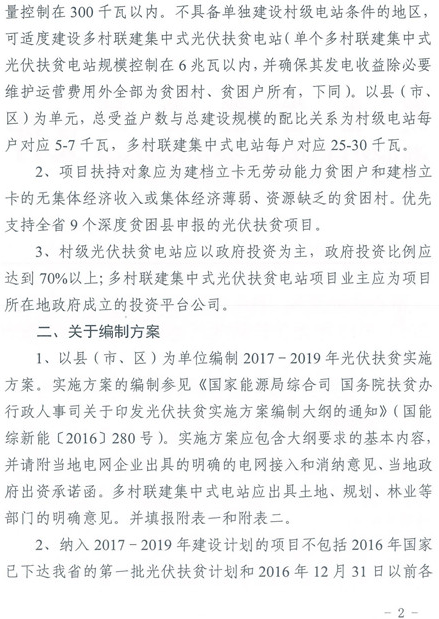 对于建设资金,通知指出村级光伏扶贫电站应以政府投资为主,政府投资比例应达到70%以上;多村联建集中式光伏扶贫电站项目业主应为项目所在地政府成立的投资平台公司。