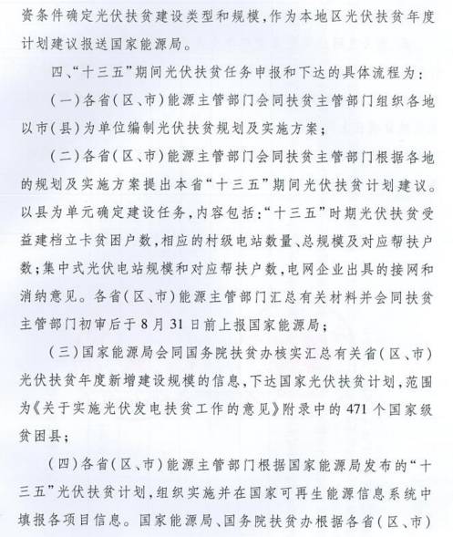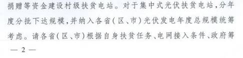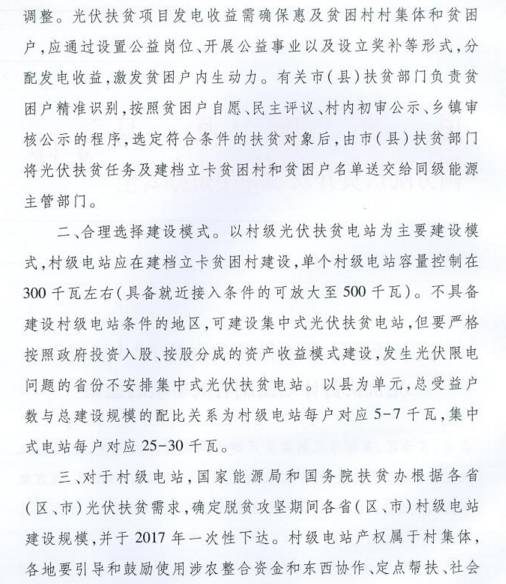 规模方面,村级电站由国家能源局和国务院扶贫办根据各省光伏扶贫需求,确定脱贫攻坚期间各省村级电站建设规模,并于2017年一次性下达;集中式光伏扶贫电站分年度分批下达规模,并纳入各省光伏发电年度总规模统筹考虑。