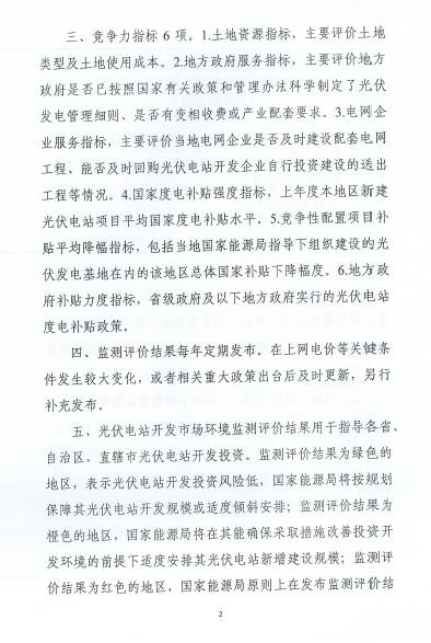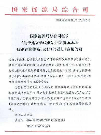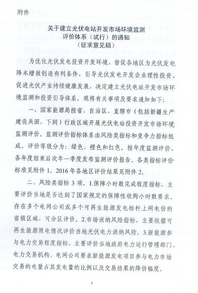 日前,国家能源局综合司发布《关于建立光伏电站市场开发环境监测评价体系(试行)的通知》征求意见稿。