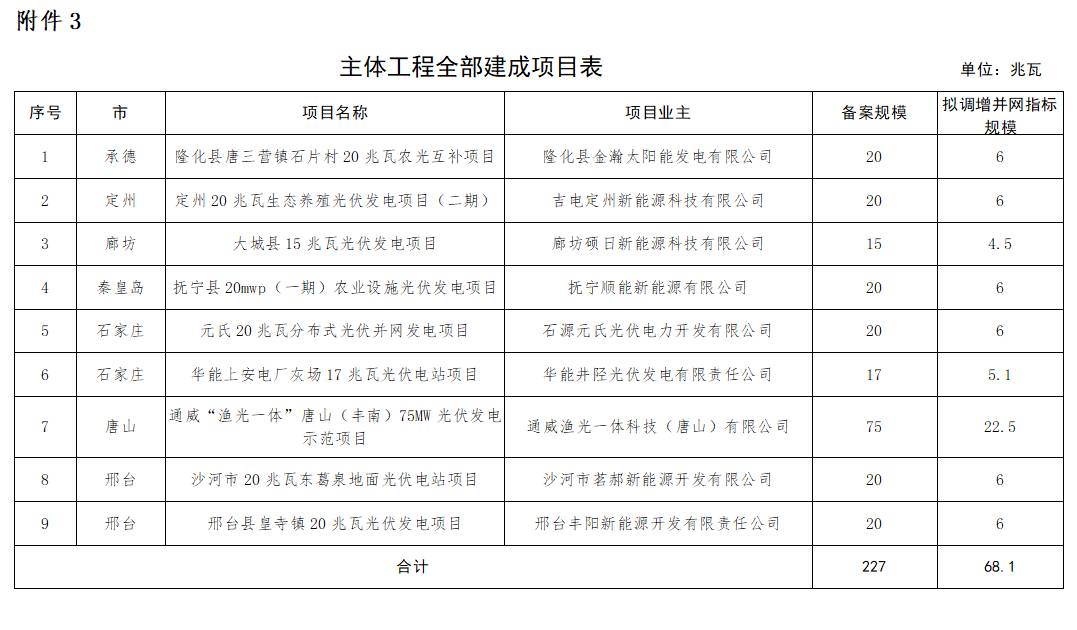三是7月17日前,已备案、主体工程全部建成,并网具备并网条件的项目,按照申报规模的30%安排指标。涉及项目9个、68.1兆瓦(附表3)。