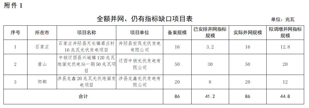 一、6月30日前,已全额并网,仍有指标缺口的项目,予以补齐缺口。涉及项目3个、44.8兆瓦(附表1)。