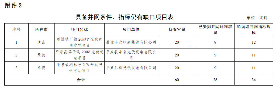 二、6月30日前,具备并网条件,但因冀北暂停并网原因未并网、仍有指标缺口的项目,予以补齐缺口。涉及项目3个、34兆瓦(附表2)。