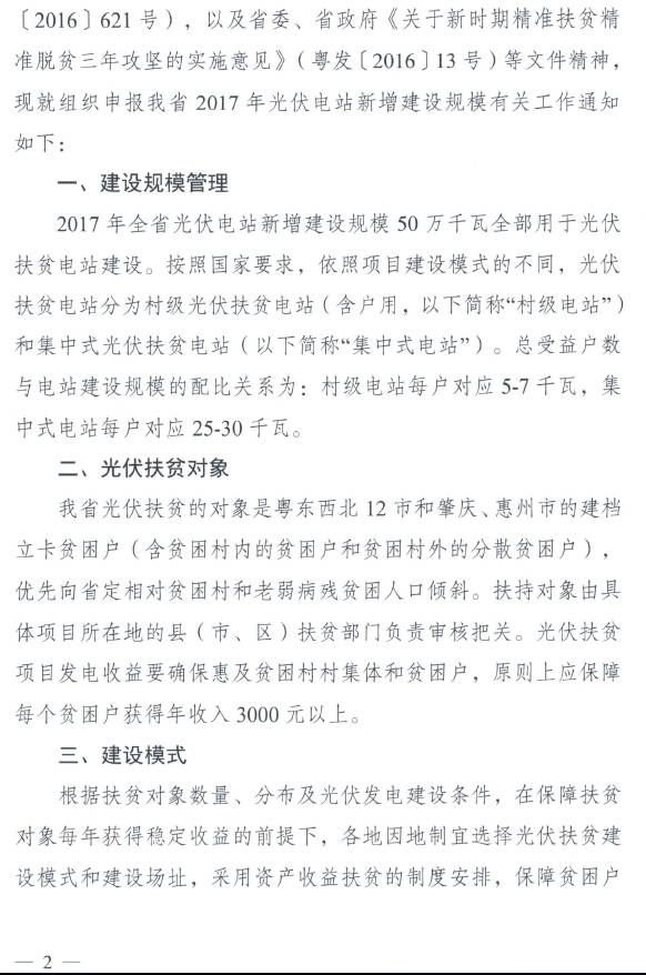 近日,广东省发改委和广东省扶贫办联合发布《组织申报2017年光伏电站新增建设规模的通知》,要求2017年500MW新增建设规模全部用于光伏扶贫,其中村级电站每户对应5-7千瓦、集中式电站每户对应25-30千瓦。指标分配将优先支持已建成、还未取得年度建设规模指标的光伏扶贫项目;此外村级电站优先纳入建设规模。从地区上看,原中央苏区、欠发达革命老区和少数民族地区以及国家绿色能源示范县的光伏扶贫项目优先纳入建设规模。对于集中式电站,综合考虑项目占地面积、项目用地性质、项目用地和扶贫资金落实情况、县级有关部门支持情况、电力消纳和送出条件、综合开发利用等因素,统筹安排建设规模。