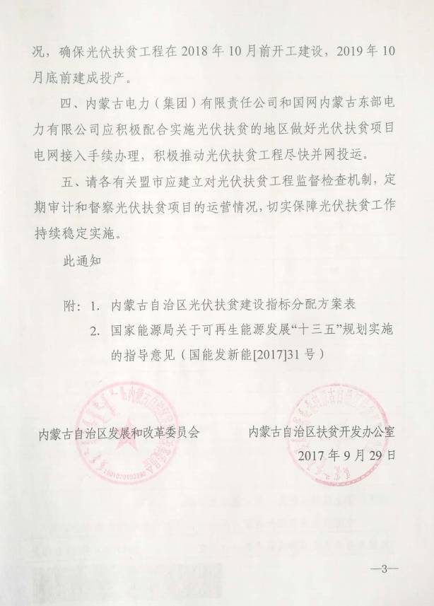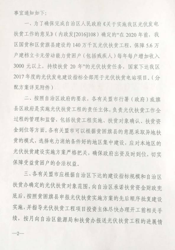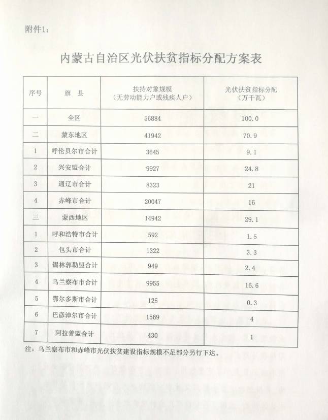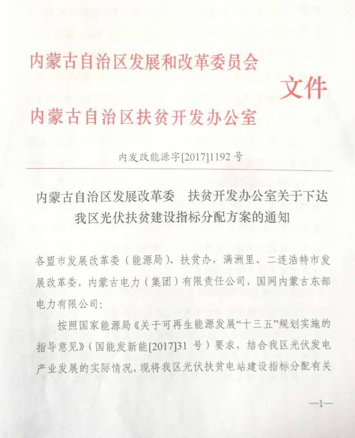 日前,内蒙古自治区发改委、扶贫办联合发文,下达关于内蒙古自治区光伏扶贫建设指标分配方案的通知。
